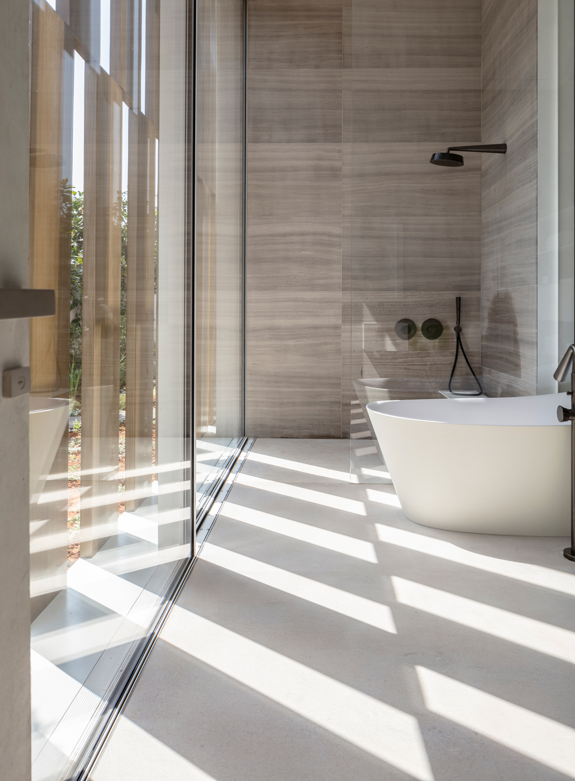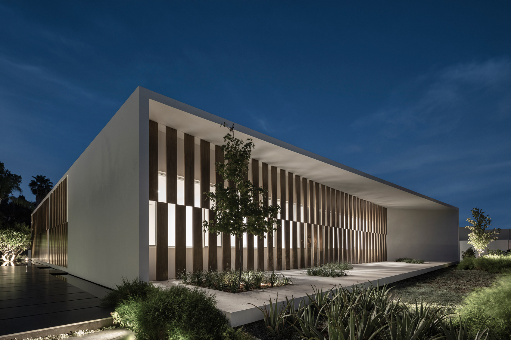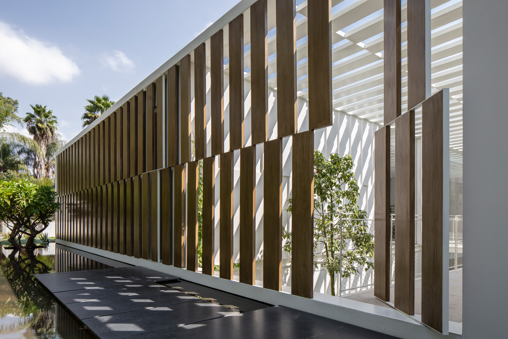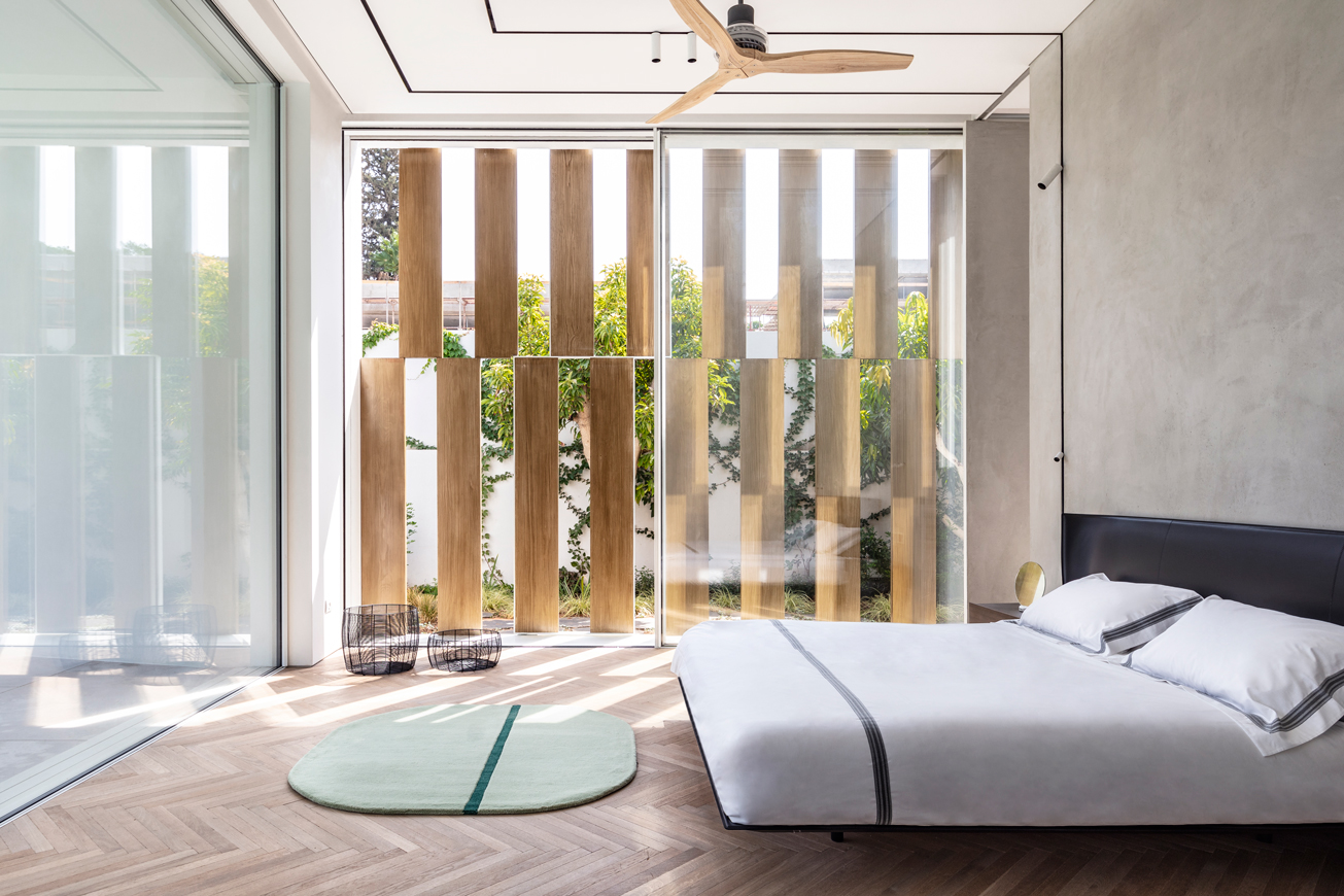 Deux passerelles relient les deux parties habitables de la maison, passant de fait au-dessus de la cour intérieure, qui s’enfonce jusqu’à sept mètres sous terre et est entièrement laissée au soin d’un jardin élégamment arboré. Mais ce sera au bardage de faire la démonstration – CQFD – de la méthodologie Kedem. Construite en béton, la maison Split est aussi bardée sur tous ses côtés de panneaux de bois et de métal espacés. Autour d’abord de ses parties extérieures, mais aussi le long des murs de l’enceinte de la cour, et jusque sur le toit de celle-ci. Eléments stylistiques chaleureux et protecteurs, les panneaux servent tout autant à la gestion de l’intimité de chaque espace qu’à celle d’un modulateur thermique. Orientée pour répondre aux rayons du soleil, la maison Split offre alors un abri idéal, présenté en demi-mesure à la lumière du jour. Un sublime claroscuro méditerranéen.