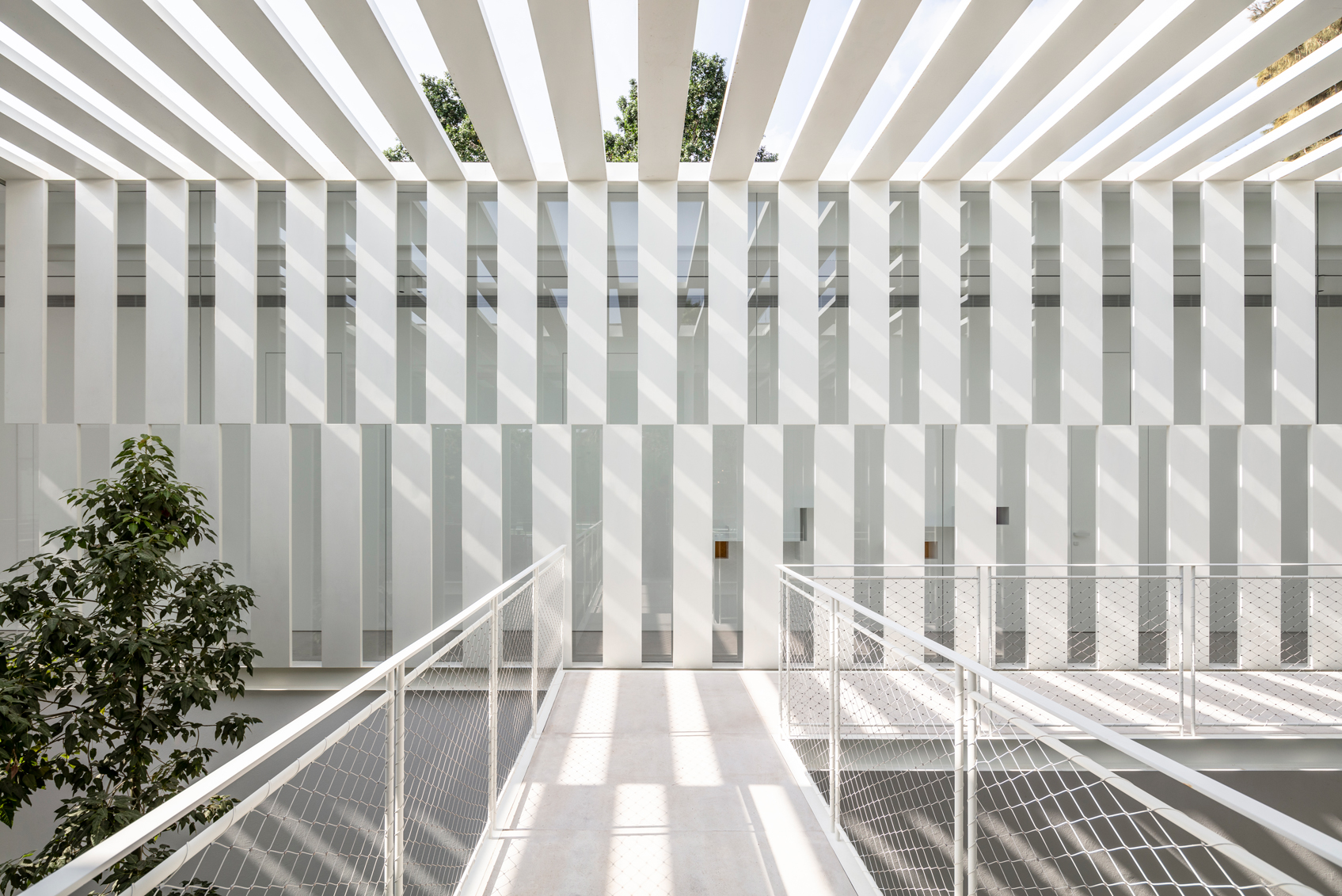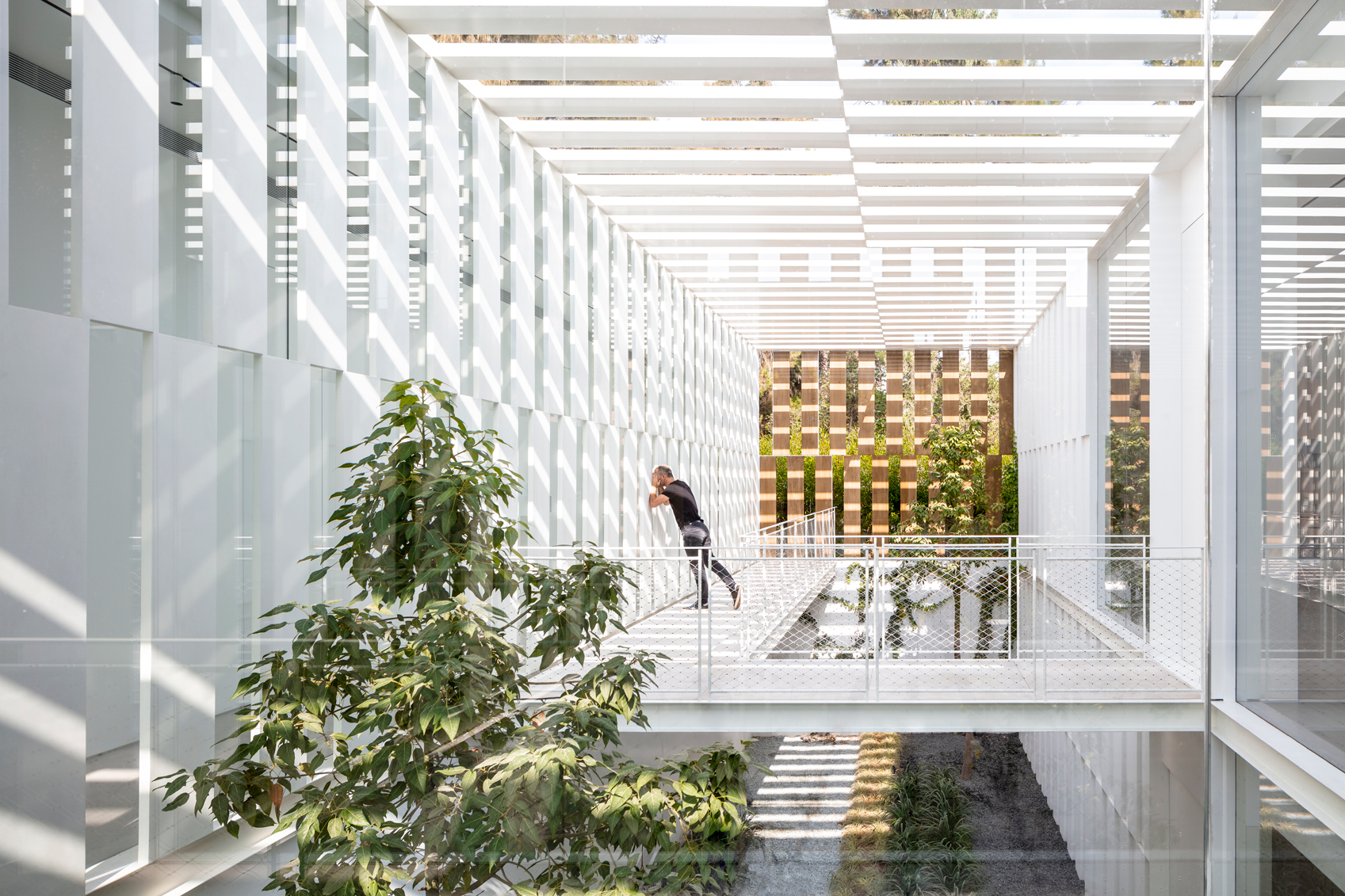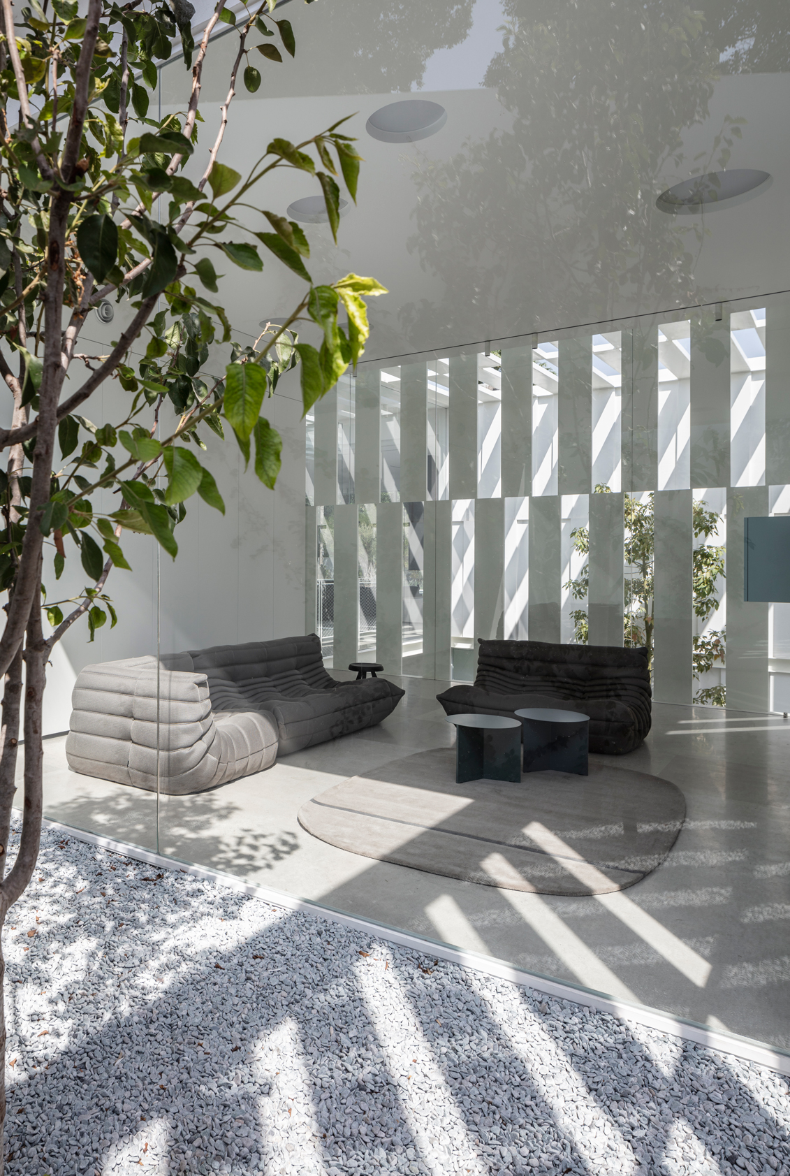 Deux passerelles relient les deux parties habitables de la maison, passant de fait au-dessus de la cour intérieure, qui s’enfonce jusqu’à sept mètres sous terre et est entièrement laissée au soin d’un jardin élégamment arboré. Mais ce sera au bardage de faire la démonstration – CQFD – de la méthodologie Kedem. Construite en béton, la maison Split est aussi bardée sur tous ses côtés de panneaux de bois et de métal espacés. Autour d’abord de ses parties extérieures, mais aussi le long des murs de l’enceinte de la cour, et jusque sur le toit de celle-ci. Eléments stylistiques chaleureux et protecteurs, les panneaux servent tout autant à la gestion de l’intimité de chaque espace qu’à celle d’un modulateur thermique. Orientée pour répondre aux rayons du soleil, la maison Split offre alors un abri idéal, présenté en demi-mesure à la lumière du jour. Un sublime claroscuro méditerranéen.