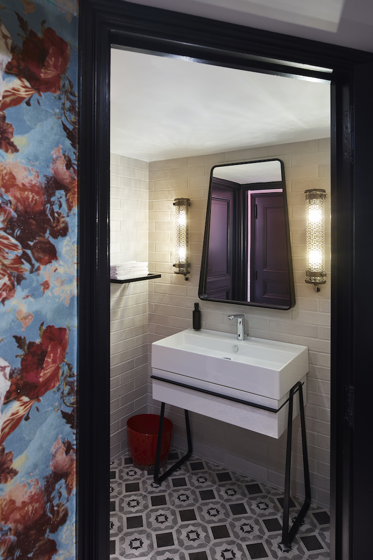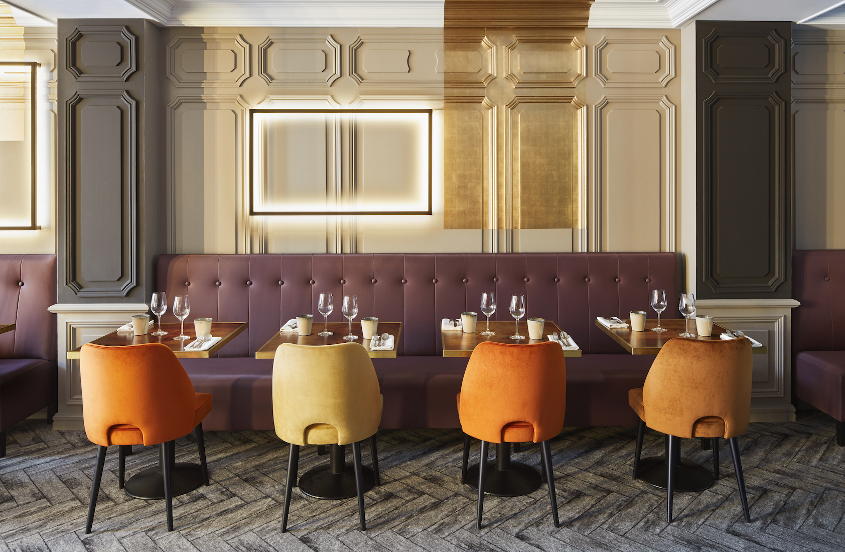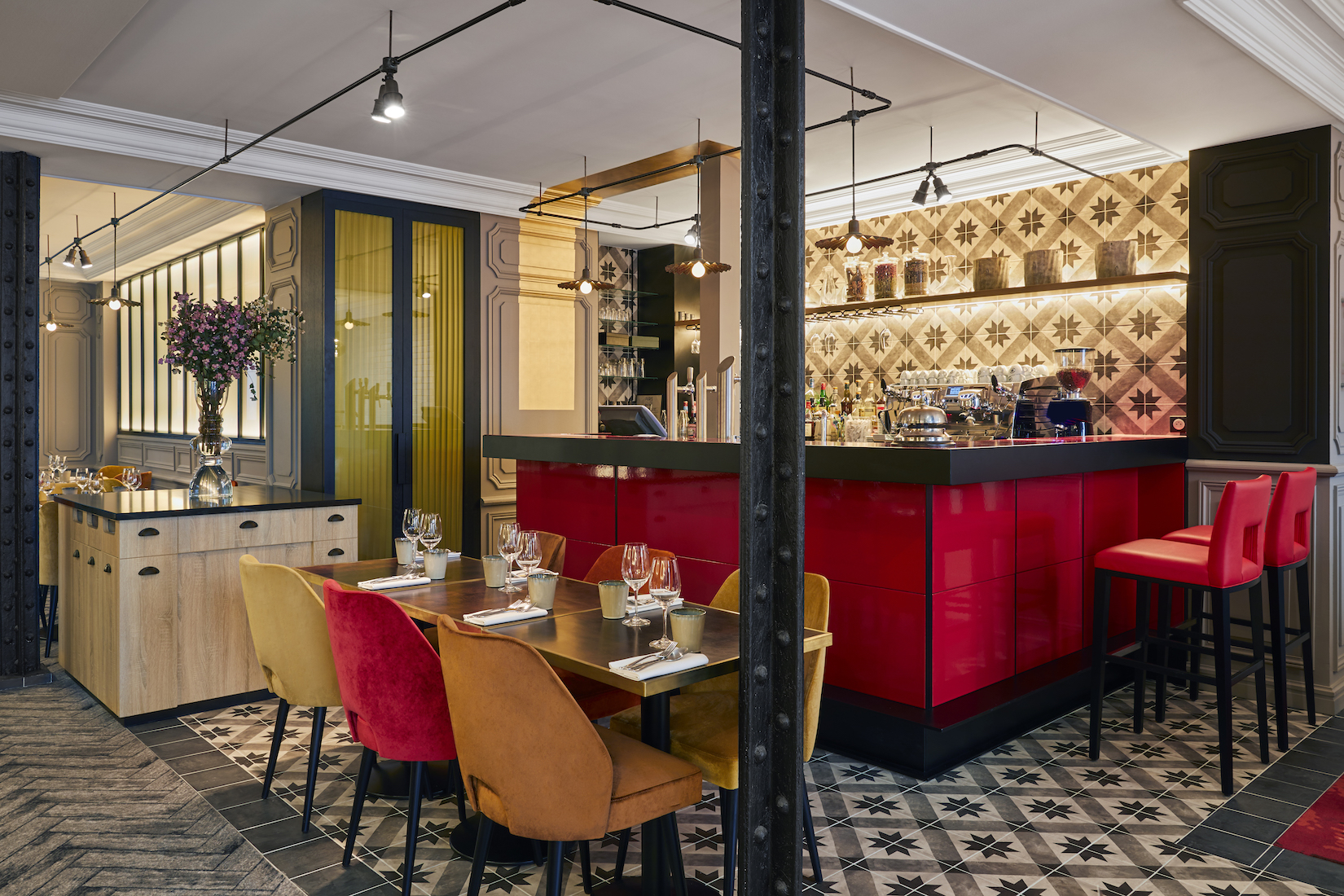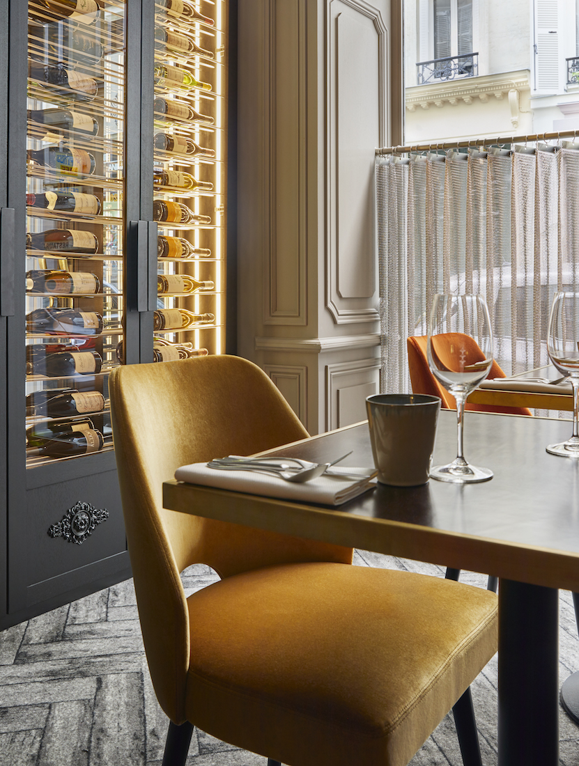 Moquettes originales (en trompe l’œil de parquet ) et carreaux de ciment revisités se côtoient au sol, délimitant les espaces. Les assises sont tapissées de revêtements variés dans les tonalités d’orangé et de violine. Dans l’entrée, tels des cabinets de curiosités, de grandes armoires vitrées en bois noir mettent en valeur vins, épices et autres produits sélectionnés par le chef.