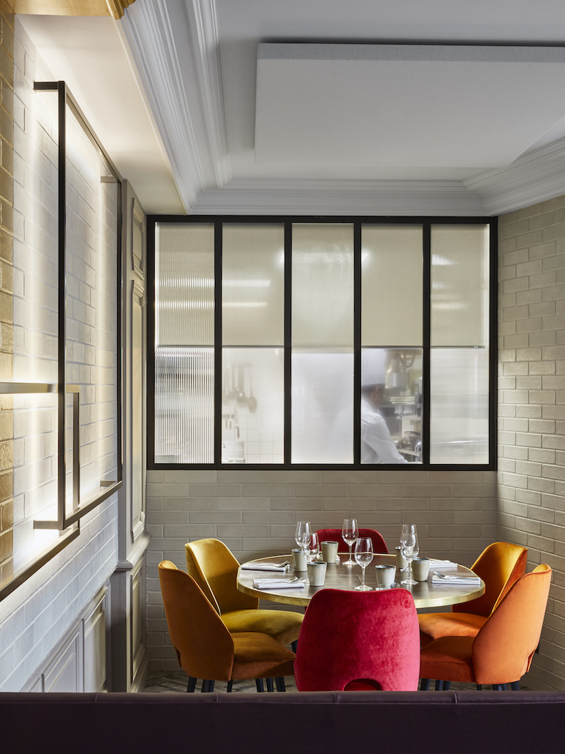 Depuis la salle, une baie vitrée offre un panorama alléchant sur les cuisines afin de prolonger encore et toujours cette idée de partage chère au chef Jean-Marc Notelet et aux architectes d’intérieur Nicolas Adnet et Marc Hertrich.