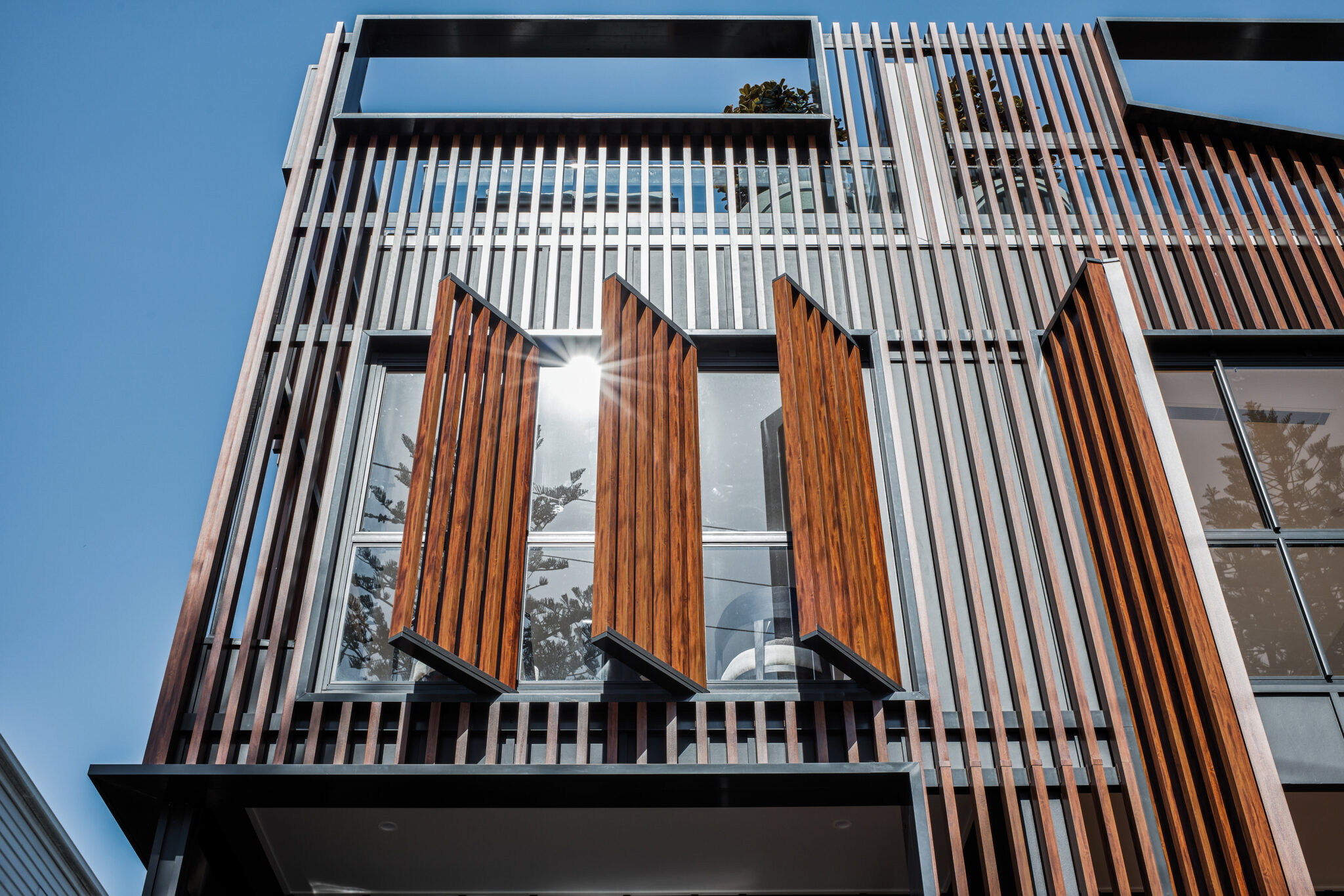 Rory Spence : La maison 8 Albatross est un ensemble de deux maisons, toutes deux sur trois étages, qui fait face à l’Océan Pacifique. Leurs particularités sont ces petits ailerons qui permettent de gérer l’intimité, les vues que l’on souhaite avoir sur le monde extérieur, mais aussi de se protéger des rayons du soleil et même de moduler l’aspect extérieur de l’ensemble. Un élément fondamental au projet.