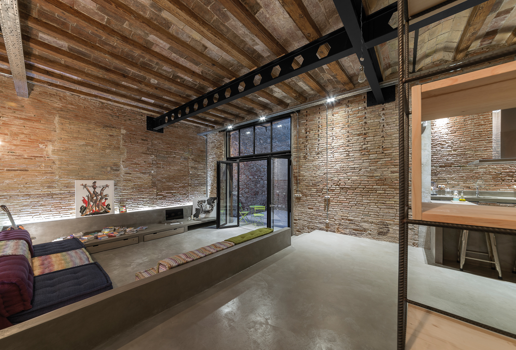 Ce loft de 122 m2 a désormais fière allure. La brique et la pierre des murs, ainsi que le plafond, auparavant dissimulés sous d’épaisses couches de gypse et de mortier, ont été révélés. Ces éléments constituent aujourd’hui l’atout charme de la maison. La présence d’un patio de 27 m2 permet également de profiter du climat méditerranéen de Barcelone. Grâce à un jeu de transparences engendrées par l’ajout de baies vitrées protégées par des volets métalliques ajourés, le propriétaire a même la possibilité de jouir visuellement de son patio depuis son vaste salon.