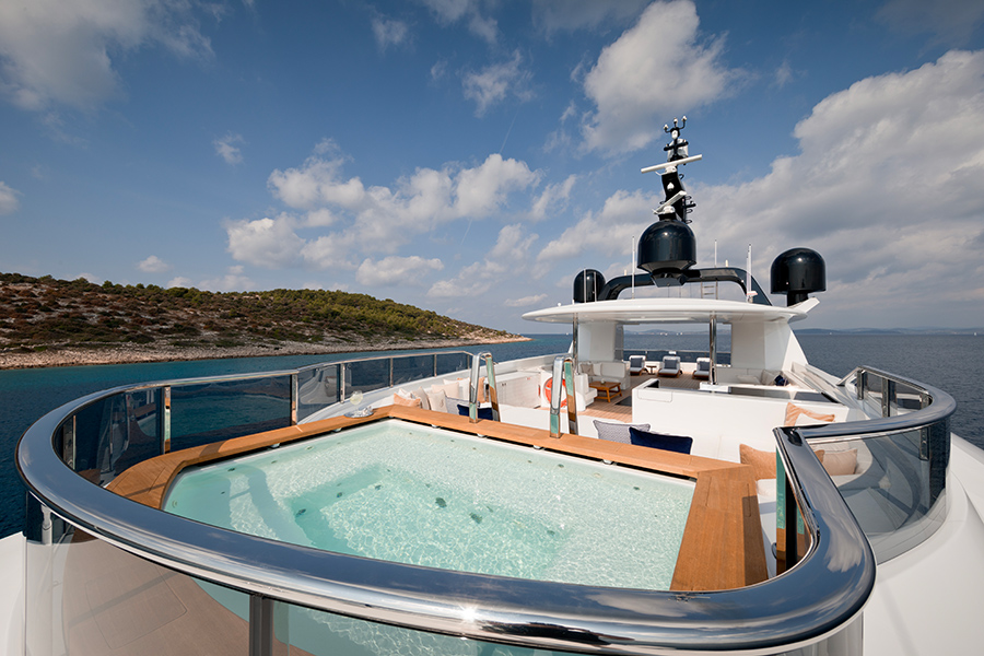 Le pont principal peut héberger 10 cabines d’hôtes dans quatre cabines ainsi qu’une suite. Les cabines, le salon principal et la salle à manger ouverts bénéficient de la lumière naturelle et de la vue mer grâce aux fenêtres pleine hauteur. Un escalier sur le pont arrière offre un accès extérieur direct au « club de plage ». En plus de la timonerie et de la cabine du capitaine, le tablier du pont offre l’espace nécessaire pour se détendre en plein air.