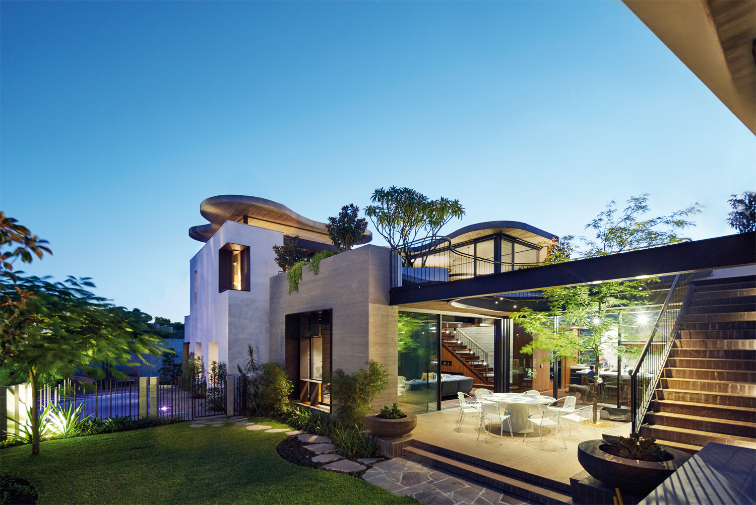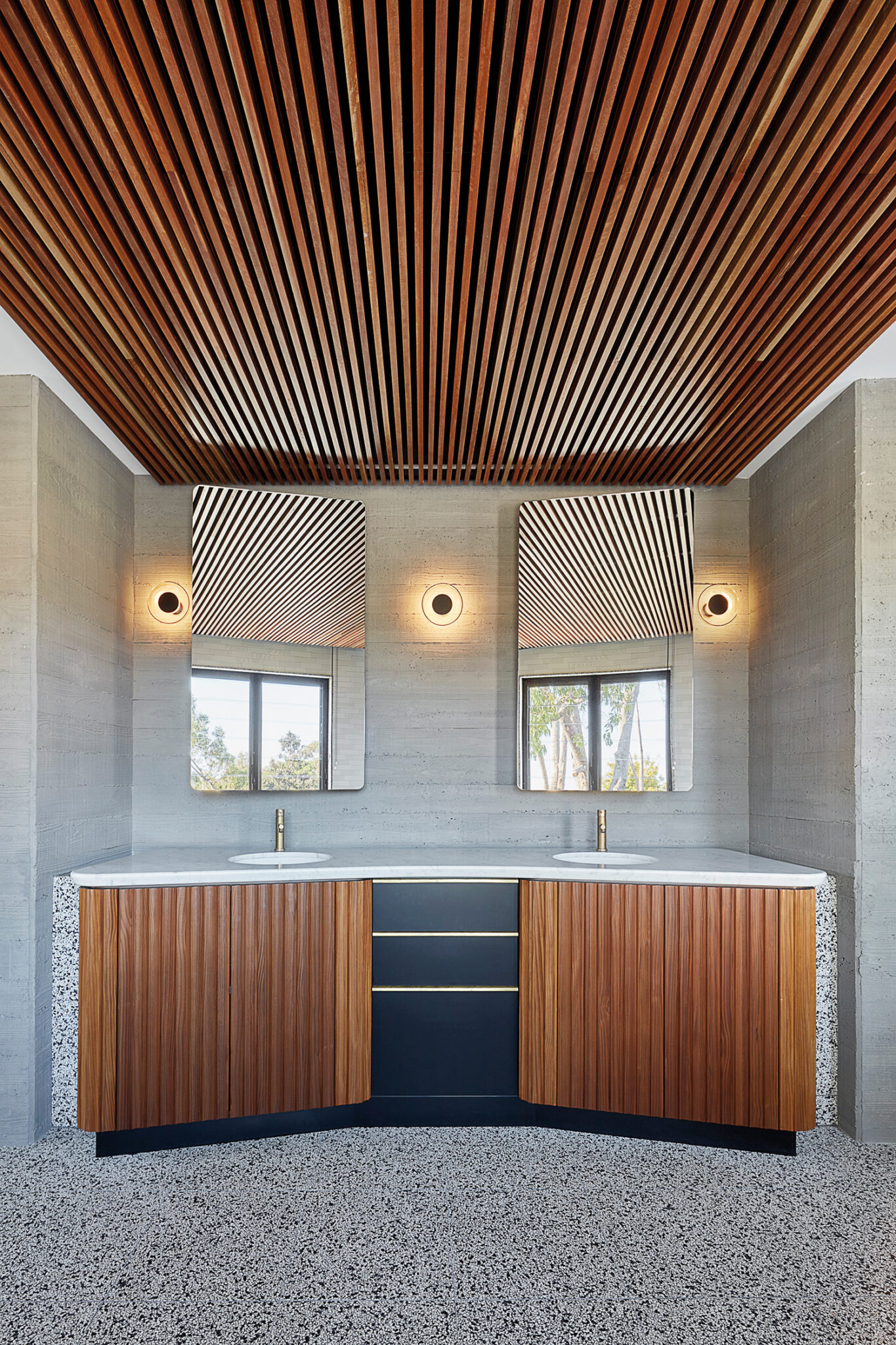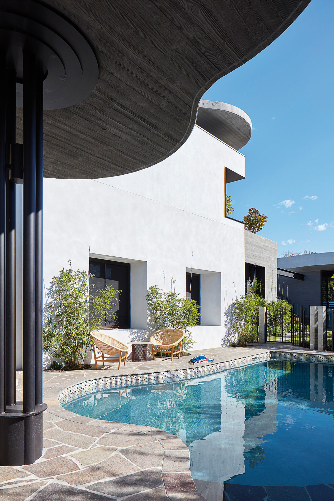 Le tout s’inscrivant dans l’esthétique japonaise « wabi sabi ». De nombreuses courbes et des formes fluides, à l’intérieur comme à l’extérieur, contrastent avec les lignes droites de la maison et quelques formes sculpturales. D’une part, elles confèrent de la douceur au projet ; d’autre part, elles font écho aux formes d’un bâtiment emblématique en front de mer : le kiosque en béton de South City Beach. Les toits en béton à l’arrière de la maison présentent aussi des courbes similaires. D’autres références aux architectes Oscar Niemeyer et Le Corbusier sont également subtilement suggérées.