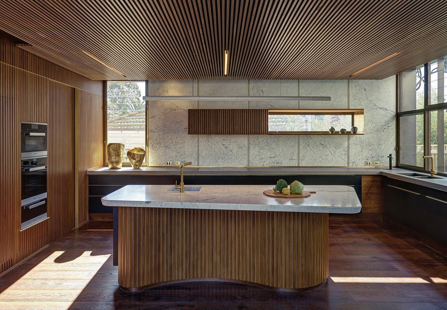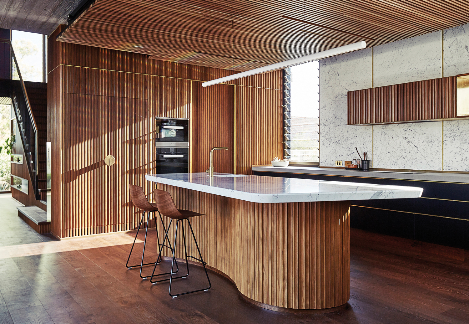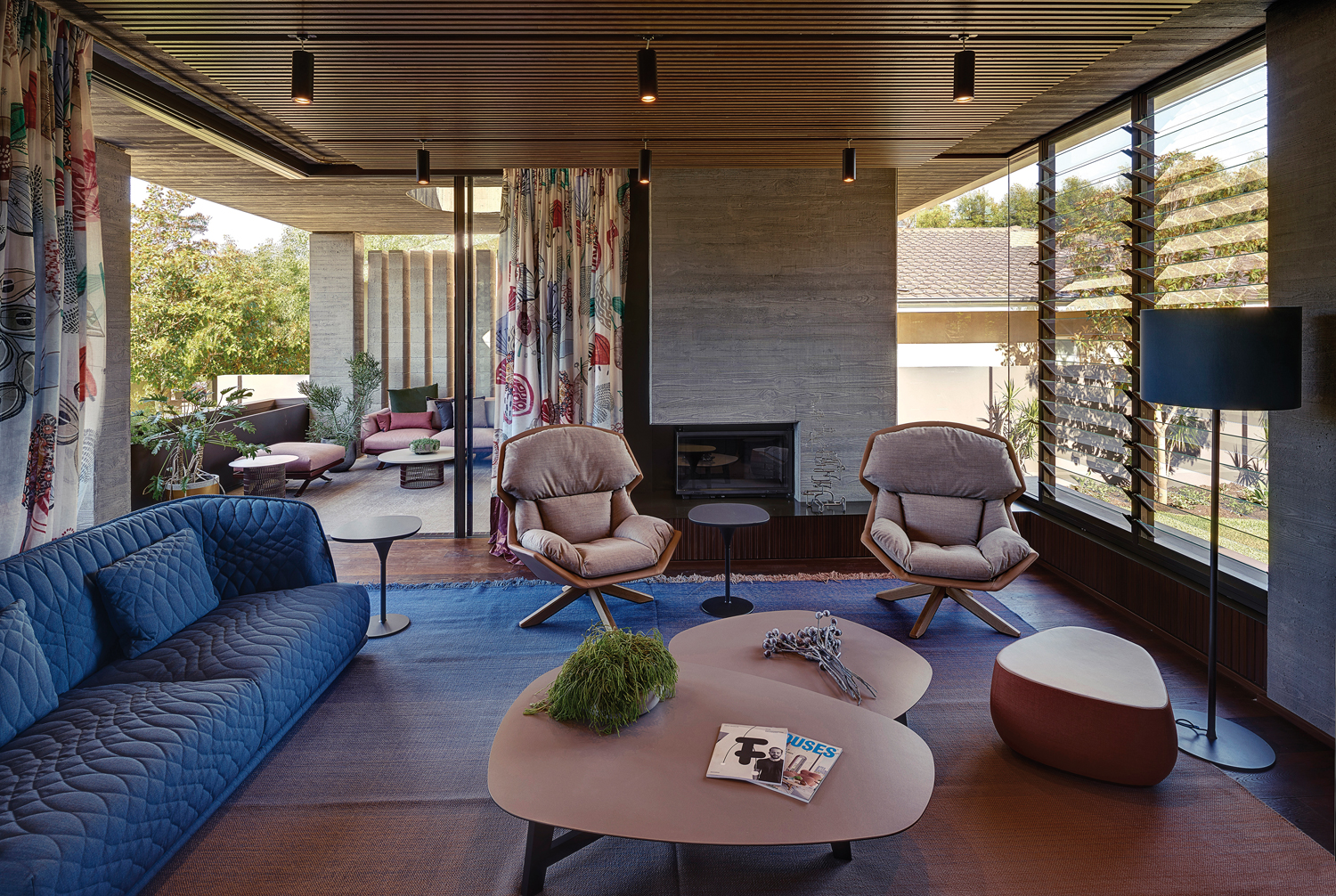Le tout s’inscrivant dans l’esthétique japonaise « wabi sabi ». De nombreuses courbes et des formes fluides, à l’intérieur comme à l’extérieur, contrastent avec les lignes droites de la maison et quelques formes sculpturales. D’une part, elles confèrent de la douceur au projet ; d’autre part, elles font écho aux formes d’un bâtiment emblématique en front de mer : le kiosque en béton de South City Beach. Les toits en béton à l’arrière de la maison présentent aussi des courbes similaires. D’autres références aux architectes Oscar Niemeyer et Le Corbusier sont également subtilement suggérées.