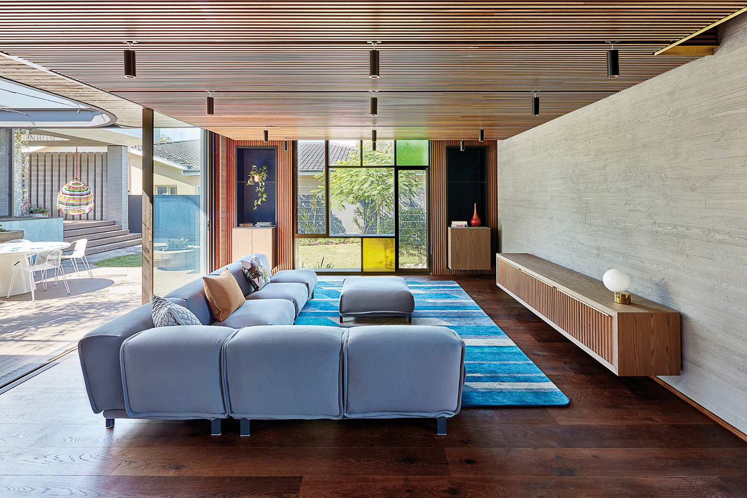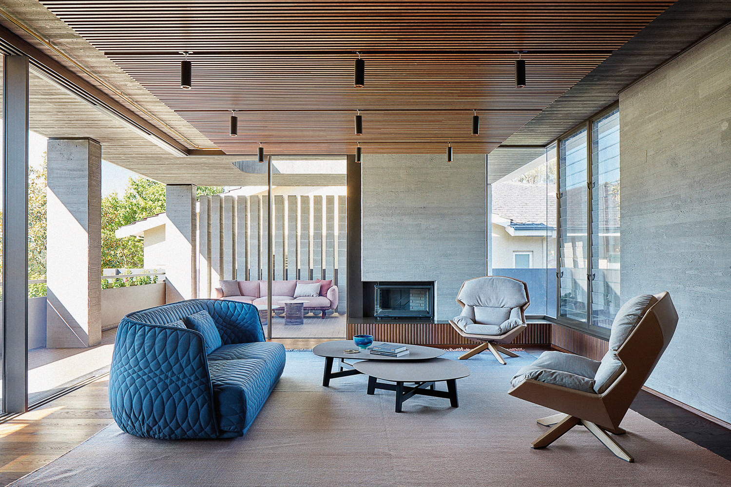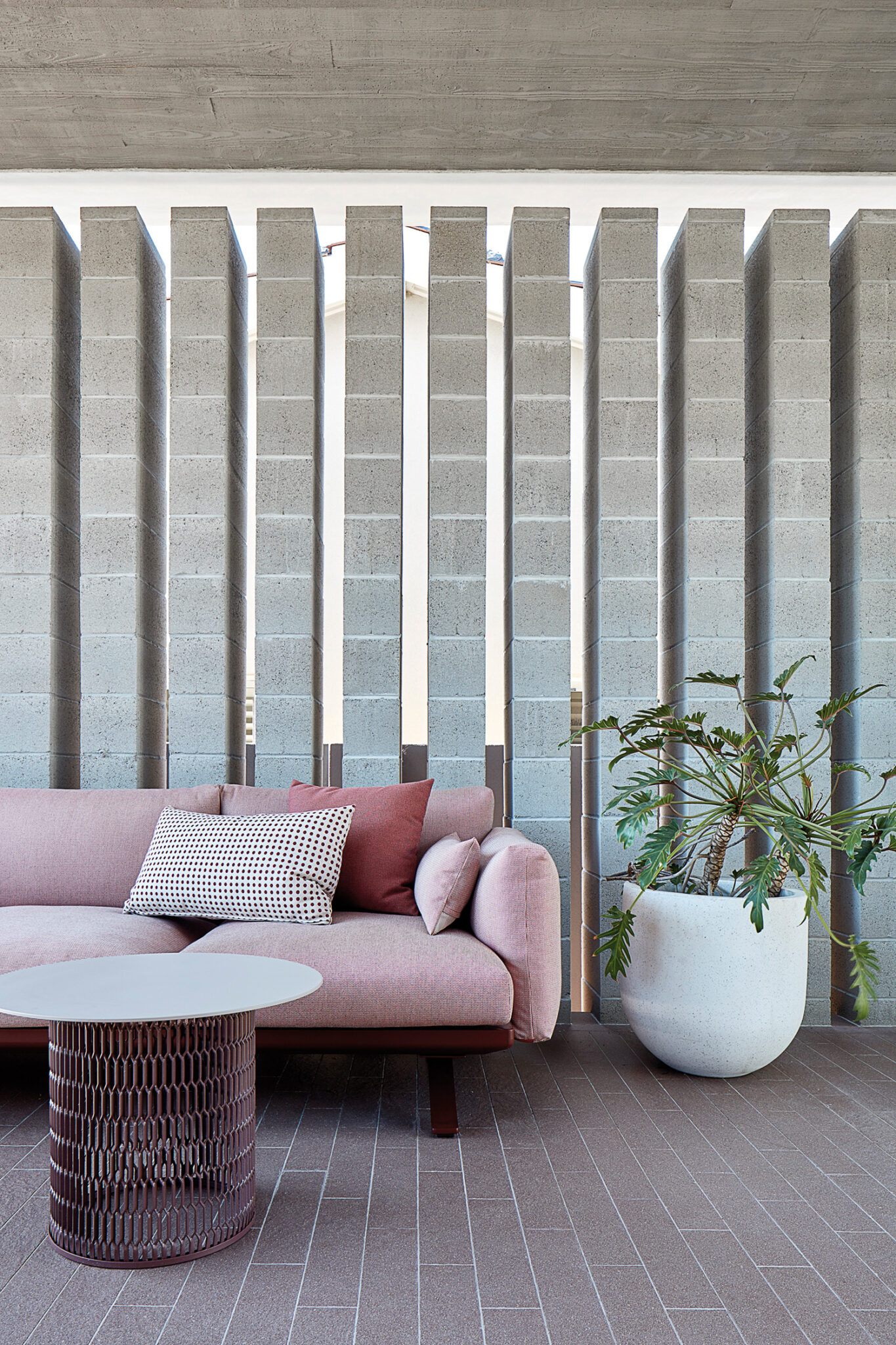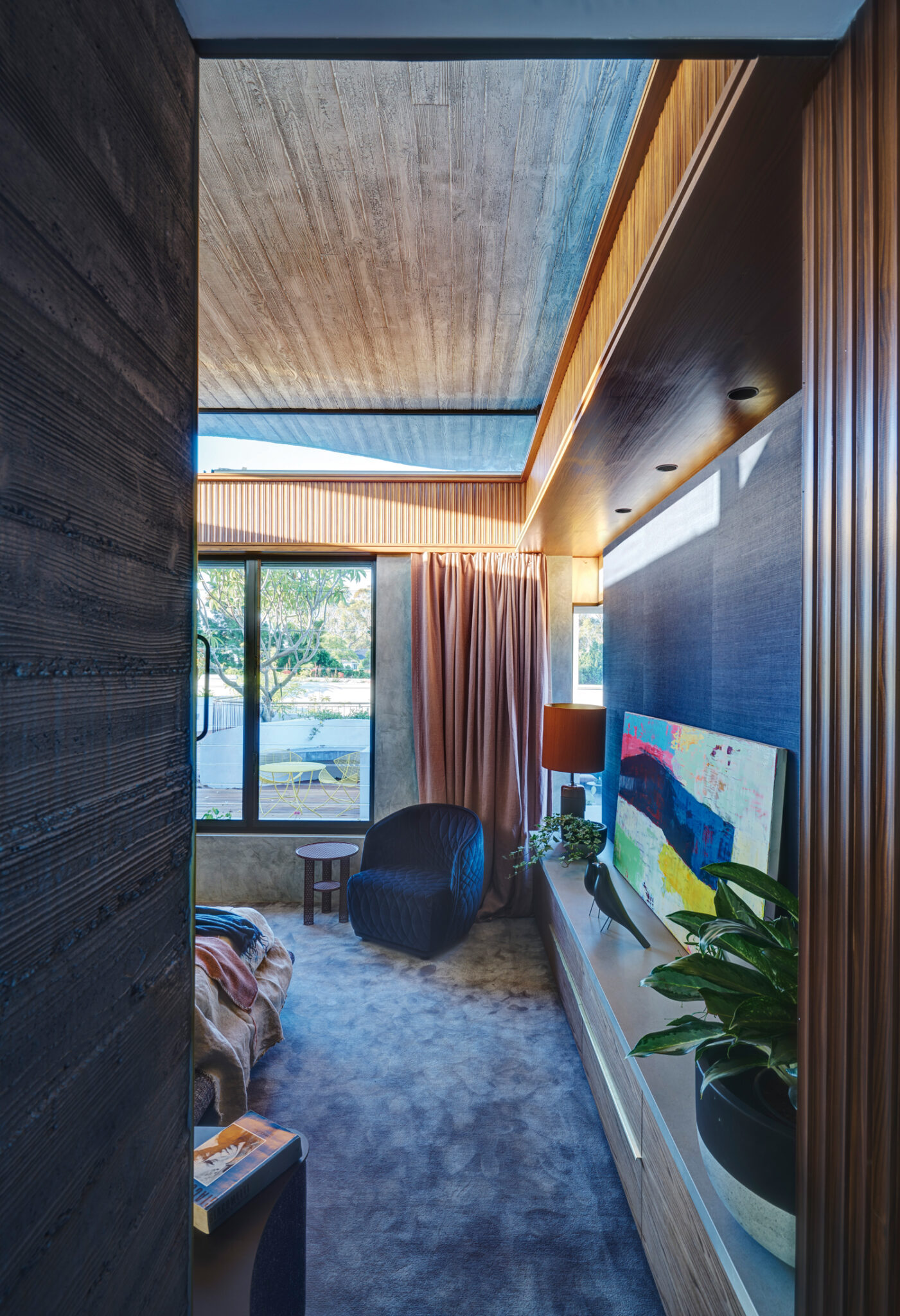 Et de fait, cet atout lui permet de concevoir des projets globaux d’une réelle cohérence, à l’image de la Roscommon House à Floreat dans la banlieue de Perth, livrée l’an dernier. Ici, il est même allé plus loin. Il a organisé l’aménagement paysagé avec l’architecte paysagiste Andrew Baronowski de Plan E Landscaping, et il a sélectionné les œuvres d’art pour la maison, celles du sculpteur Peter Zappa et de l’artiste Kate Elssey. La demeure de plus de 500 m2, munie de panneaux photovoltaïques et pensée durablement, affiche une volontaire sobriété côté rue. Originalité et autres points singuliers sont à l’abri des regards. Elle possède un vaste rez-de-chaussée, un sous-sol et un étage moins large, abritant la suite parentale donnant sur une grande terrasse végétalisée. Soucieux d’intégrer chaque bâtiment dans son contexte, Neil Cownie s’est inspiré de l’environnement de la maison – un héritage important assez unique d’immeubles modernistes et brutalistes – pour la bâtir. Une identité forte qui convenait parfaitement aux propriétaires, amoureux du modernisme et du béton.