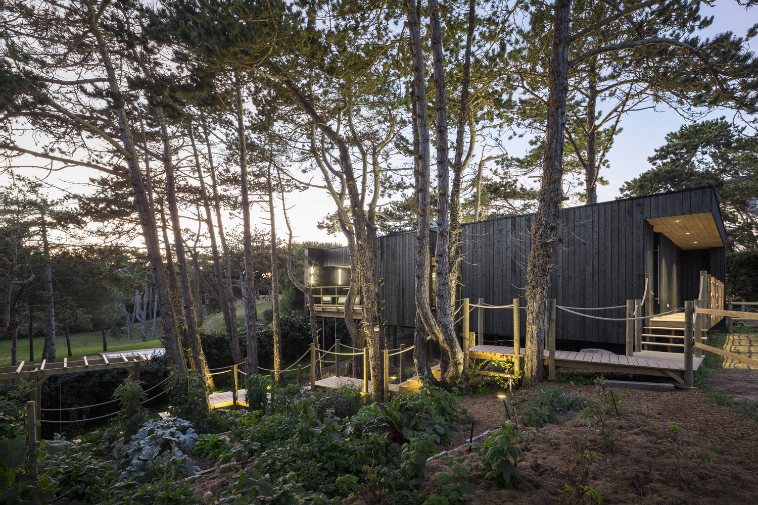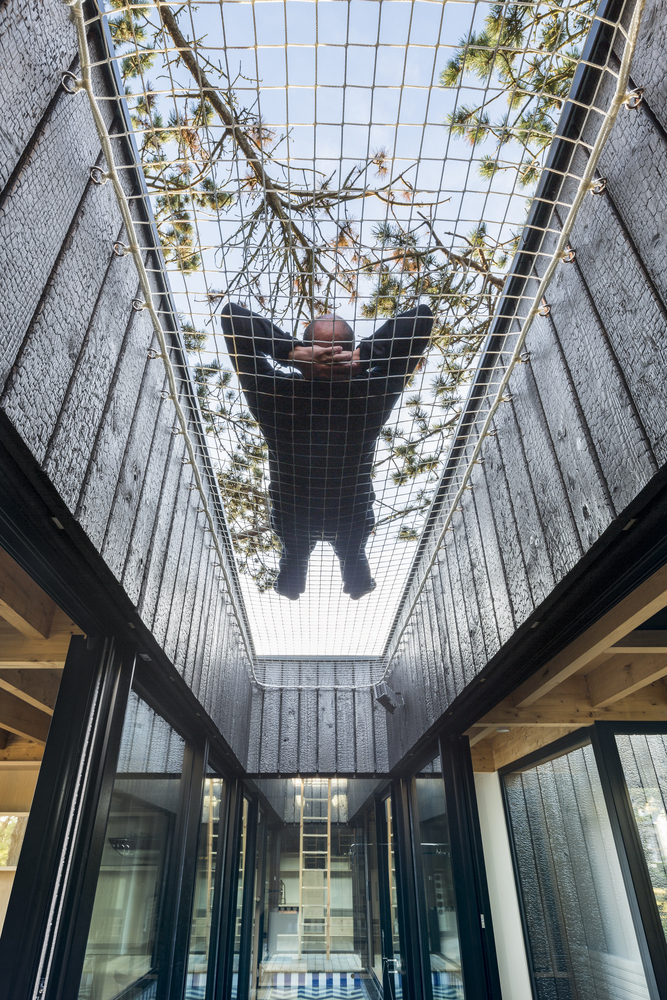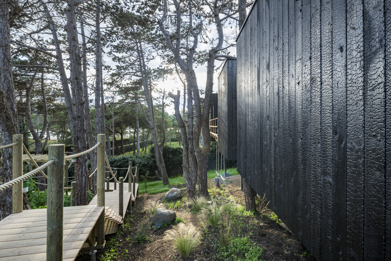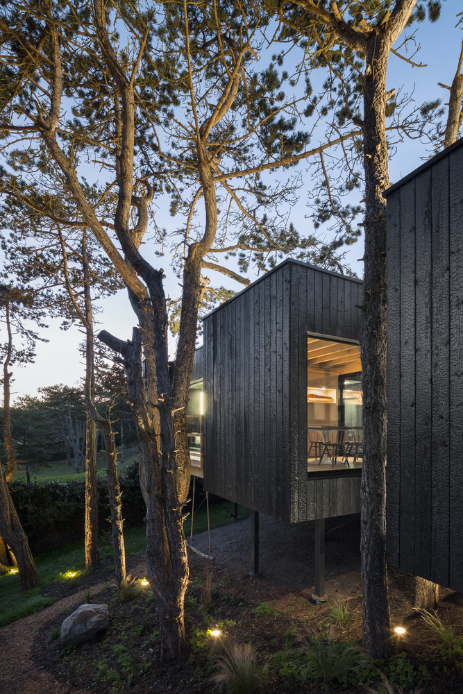 Située sur un sol sablonneux, la cabane dans les arbres a été conçue comme une structure légère. Surélevés entre 1 et 3 mètres, de profonds tas de vis élèvent la maison tout en préservant les racines de pin environnantes. En forme de volume rectangulaire de bois brûlé sculpté par les arbres ainsi que la lumière, le solide est composé de vides, de fenêtres.