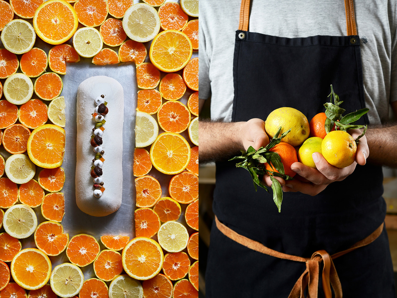 Bûche Agrumes de Corse et Pistache : Crème Glacée Orange, Crème glacée Pistache Bio, Curd citron, Croustillant Pistache et moelleux à l’orange.