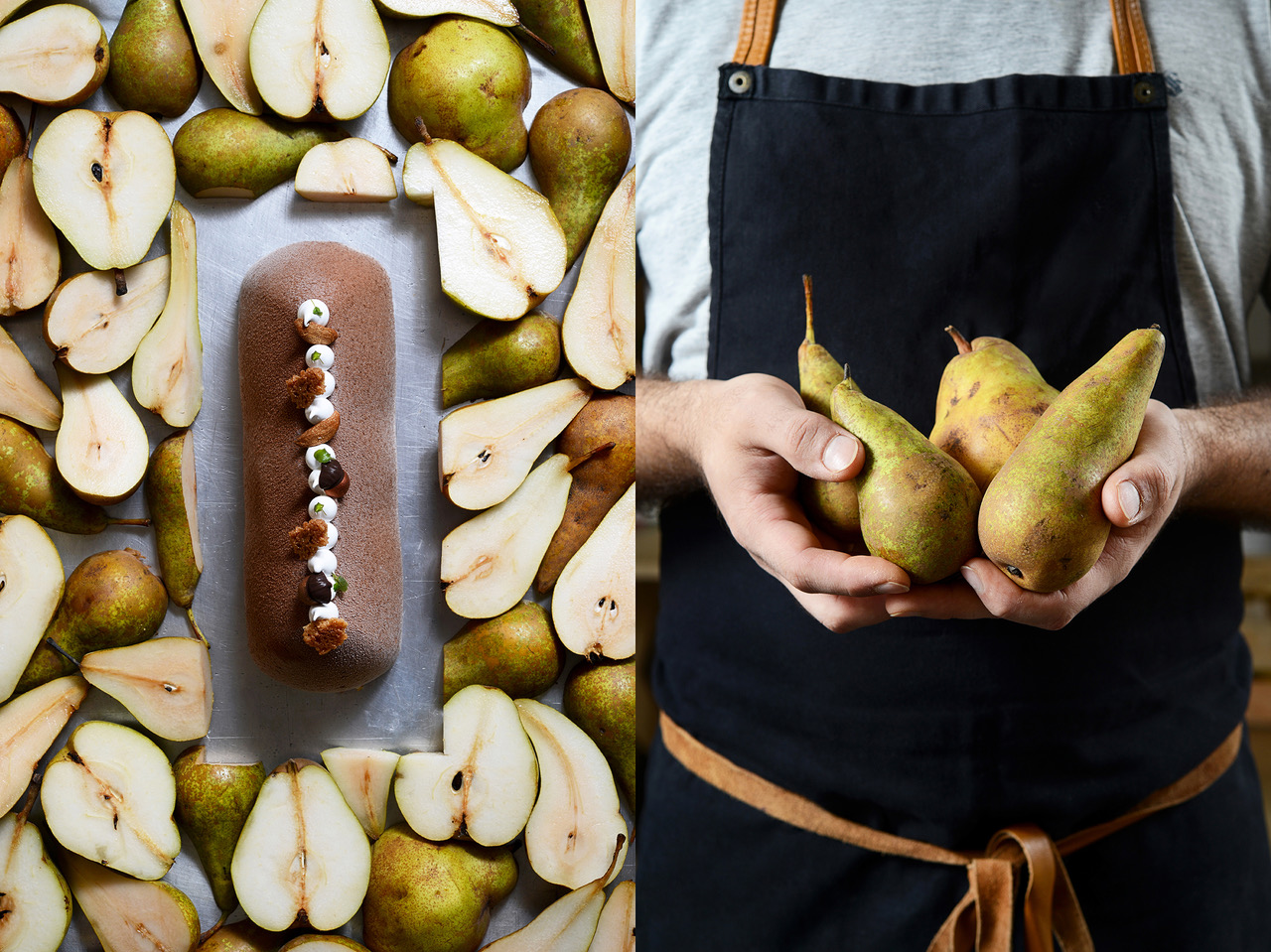 Bûche Poire et Amande : Sorbet Poire Comice, crème glacée amande d’Avola, Streuzel au beurre de Bresse, Génoise au jus de poire.