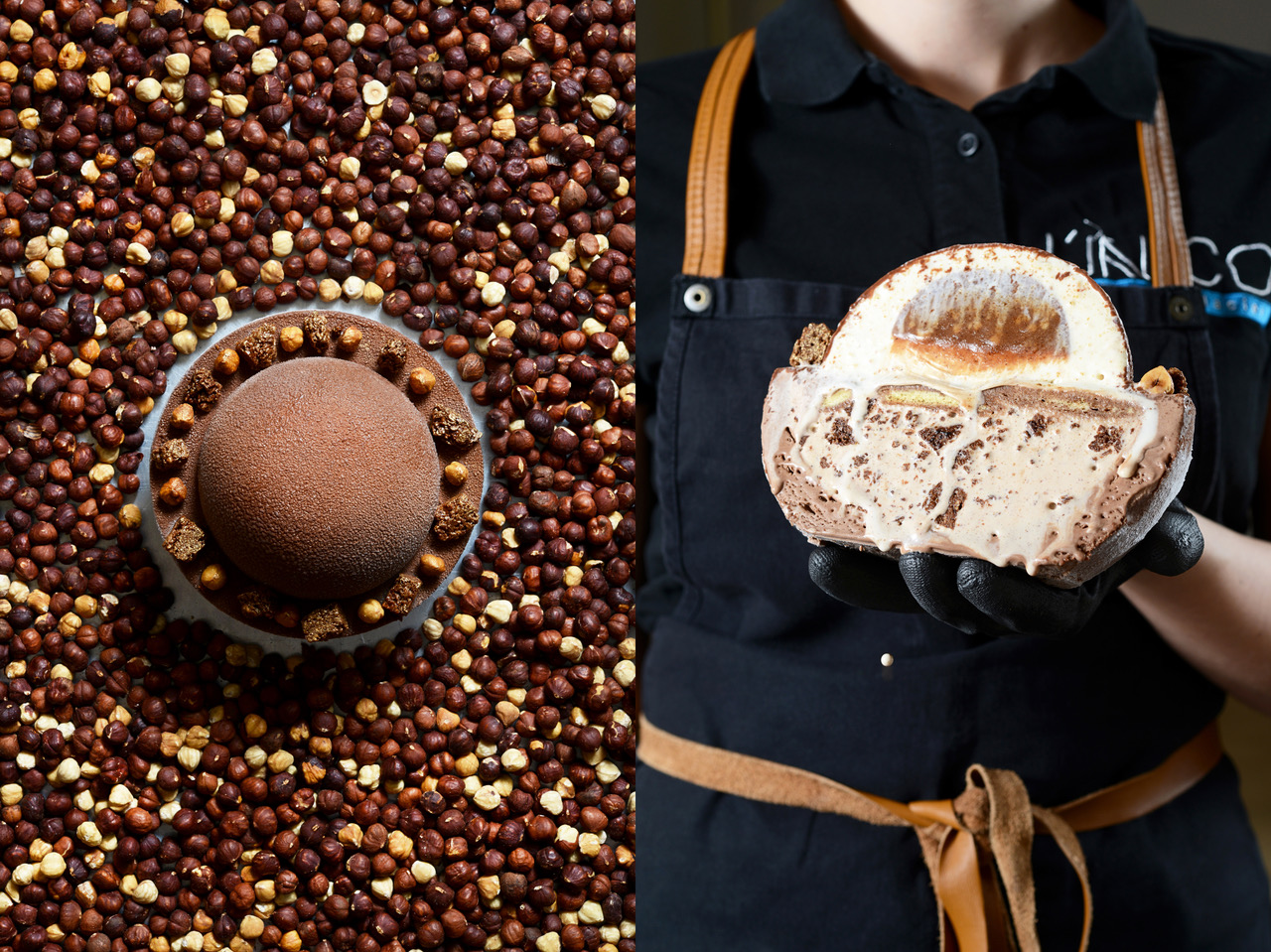 Le Rocher Noisette : Crème glacée Noisette, ganache gianduia, croustillant praliné et fleur de sel, crème glacée pâte à tartiner maison, glace chocolat et génoise chocolat (édition limitée).