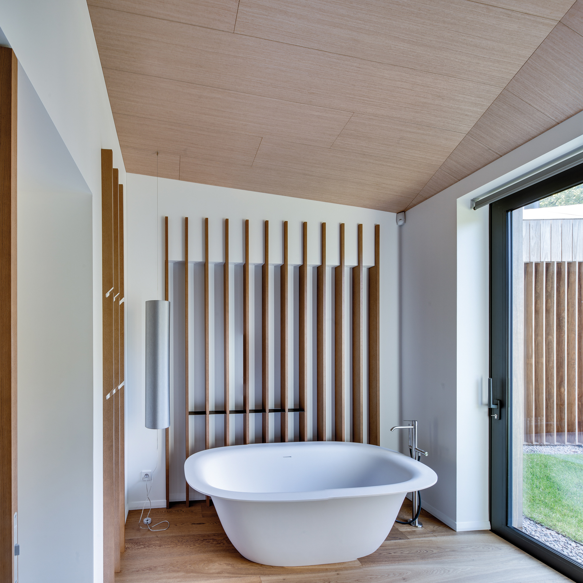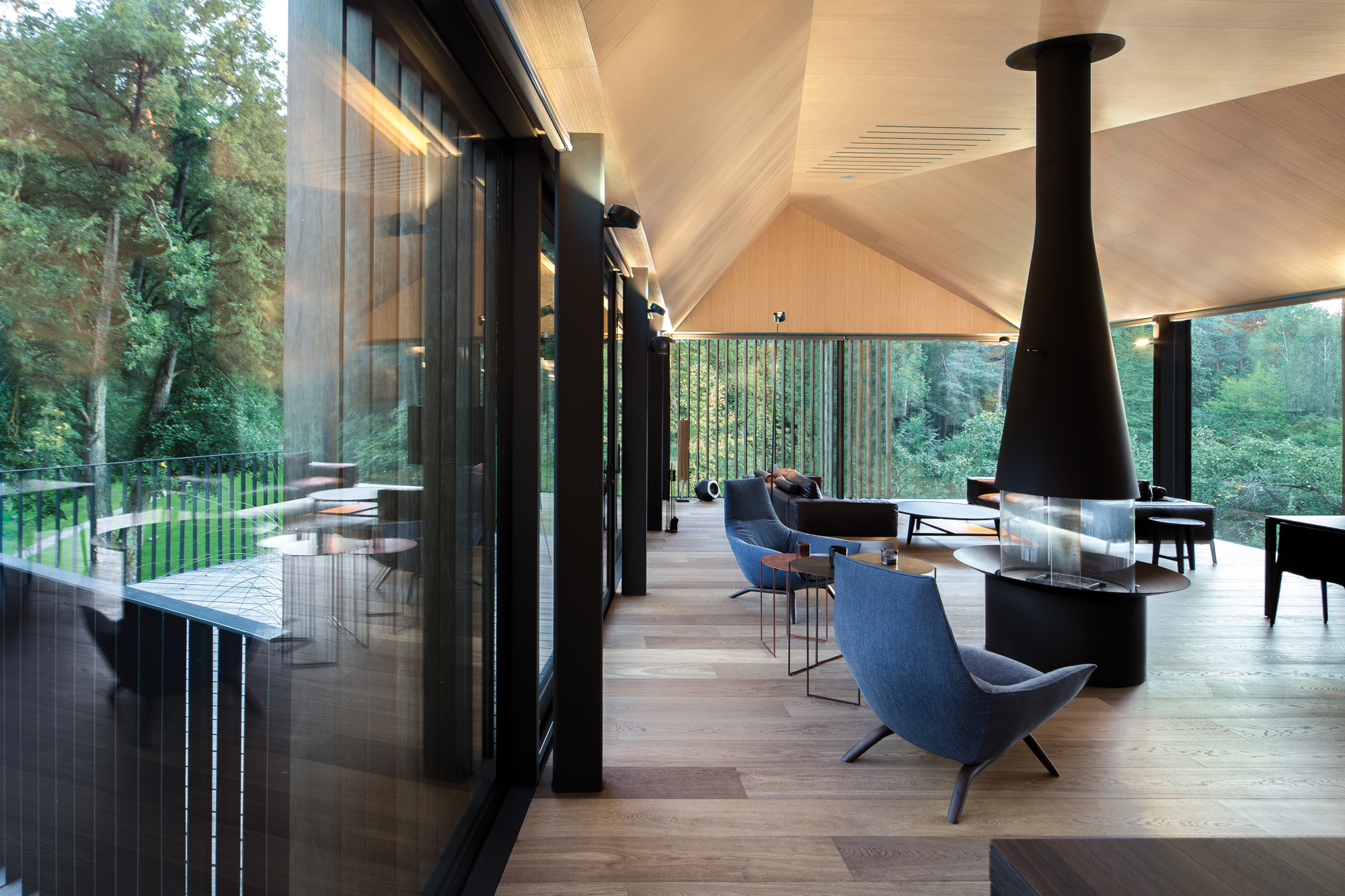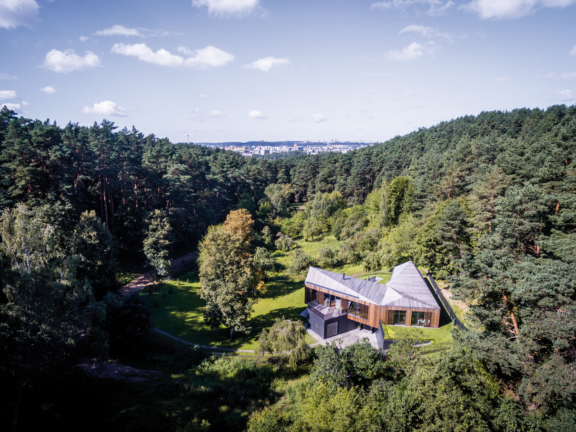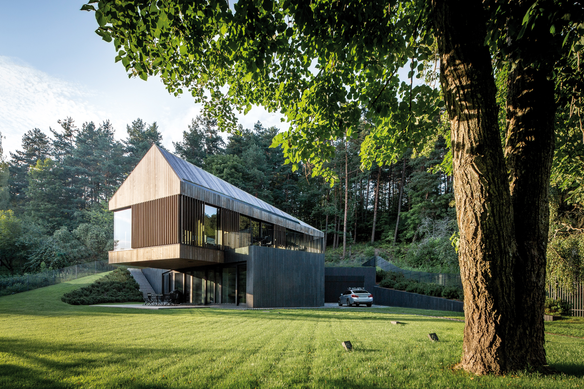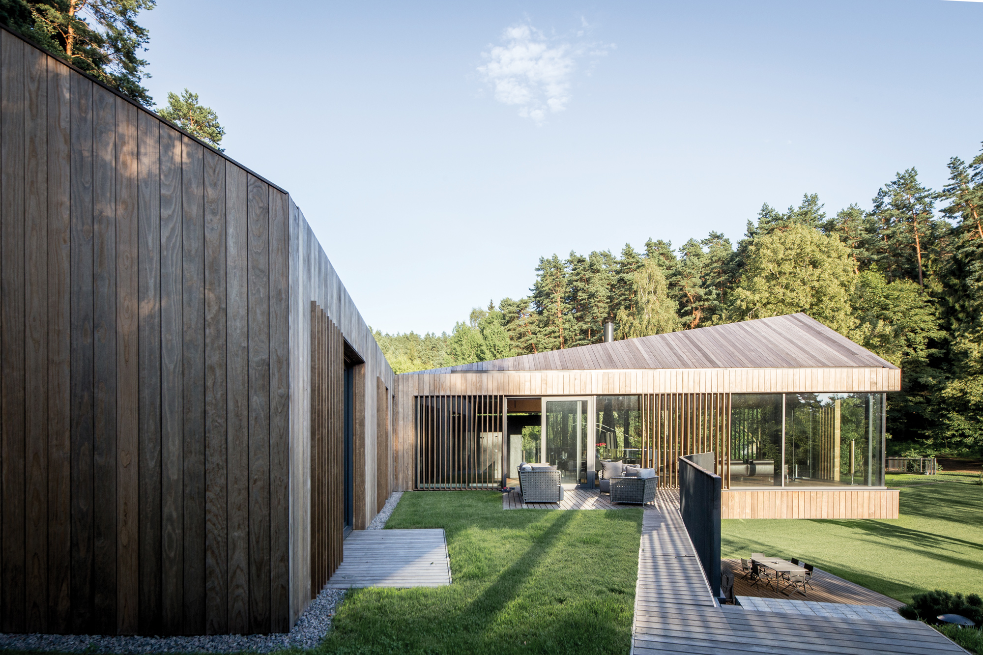 L’histoire débute en 1993, par une bande de copains, tout droit sortis de l’école technique de Vilnius, en Lituanie. Après quelques rebonds et déboires, l’association se disperse puis se reforme, pour créer entre 2000 et 2002 ce qui allait devenir Arches, une petite agence de jeunes créatifs, qu’il conviendrait aujourd’hui d’appeler une véritable pépinière d’imagination. Responsable du projet Valley Villa, l’agence Arches montre là, encore une fois, son talent de réflexion et d’exécution. Hautement inspirés par les forêts de Lituanie, les architectes ont aussi pioché dans les codes des habitations anciennes de la région pour offrir une réponse moderne à ce projet. Installée sur l’ancien site d’une ferme, la Villa est située à quelques kilomètres seulement de Vilnius. Ici pourtant, rien n’y paraît, et seul le bruissement des branches dans le vent des pins semble rythmer les jours et les nuits. C’est d’ailleurs de ce pin que la maison Valley Villa a été partiellement couverte, un pin Kebony, certifié FSC® (Forest Stewardship Council), qui assure une qualité et une durabilité à ce matériau, presque à toute épreuve. Si le clin d’œil est fait à l’environnement, le bardage de bois d’une maison, inscrite en pleine nature, est aussi une façon délicate d’insérer le bâti au cœur de la forêt. À l’image des troncs fins des arbres qui les entourent, les lames de la maison se suivent pour créer une armure élégante face aux températures parfois extrêmes des saisons.