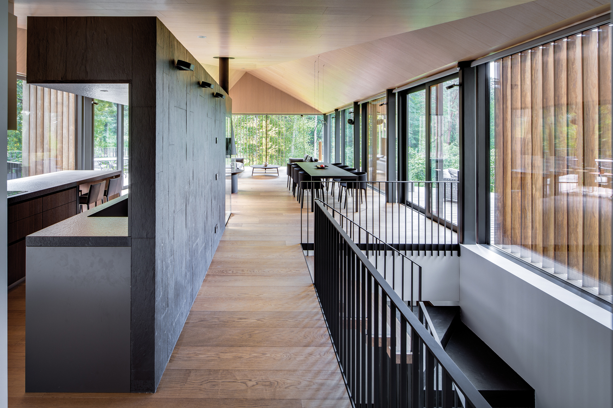 Au rez-de-chaussée, les architectes ont opté pour une finition de schiste noir, qui termine d’insérer discrètement la maison dans son contexte naturel. Composée de deux blocs en forme de V, posés l’un sur l’autre mais en sens inverse, la maison offre des saillies qui s’élancent dans plusieurs directions. Cette géométrie explosée rompt avec l’uniformité presque monotone du schiste noir et plus haut, du bardage de bois, pour offrir une architecture expressive, libre. À l’intérieur, les architectes ont laissé l’espace s’exprimer, et aux pièces de longer sans entrave ou presque, les larges baies vitrées qui offrent une vue directe sur le monde et la vie extérieurs. Cuirassées de bois blond, les pièces donnent l’impression d’une clarté naturelle perpétuelle qui rompt, là aussi, avec un extérieur parfois sévère. Si, grâce au vitrage omniprésent, la maison est entièrement reliée au monde qui l’entoure, celui-ci est aussi accessible de toutes les pièces de la maison, par des ouvertures et autres baies vitrées. Petites cours privatives, terrasses au premier étage, apportent, quant à elles, la touche nécessaire à une vie intime, loin du regard des autres hôtes. Mais au final, c’est le contraste qui domine la Valley Villa. Celui de son hyper graphisme qui s’oppose mais aussi s’immisce parfaitement dans son environnement. Celui de ses matériaux naturels pourtant taillés pour le confort des hommes. Et peut-être aussi, sa simplicité de mise qui cache en fait, une architecture hautement maîtrisée et discrètement dominatrice.