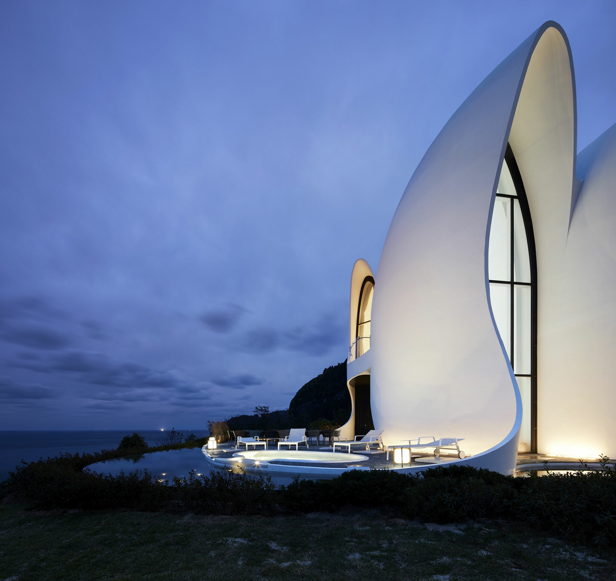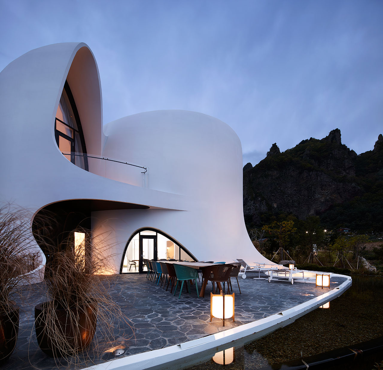 The System Lab a livré avec son design futuriste une élégante villa singulière . Conçu comme un «réservoir d’énergie» et inspiré par le tourbillon céleste des planètes et des étoiles, Healing Stay KOSMOS resort a été conçu comme un observatoire du cosmos, d’où son nom, avec chaque chambre et espace commun méticuleusement orienté selon une vue spécifique . Fabriqués à partir de béton ultra-performant, les deux bâtiments blancs de la station, Villa Kosmos et Villa Terra, ont été sculptés dans des compositions tout en courbes qui évoquent à la fois les mouvements célestes du soleil et de la lune et le paysage vallonné.