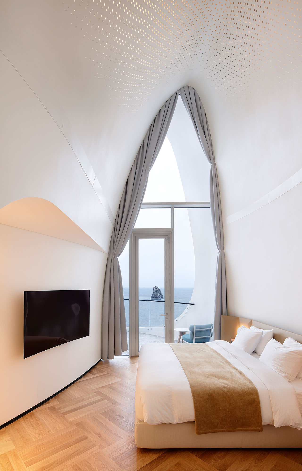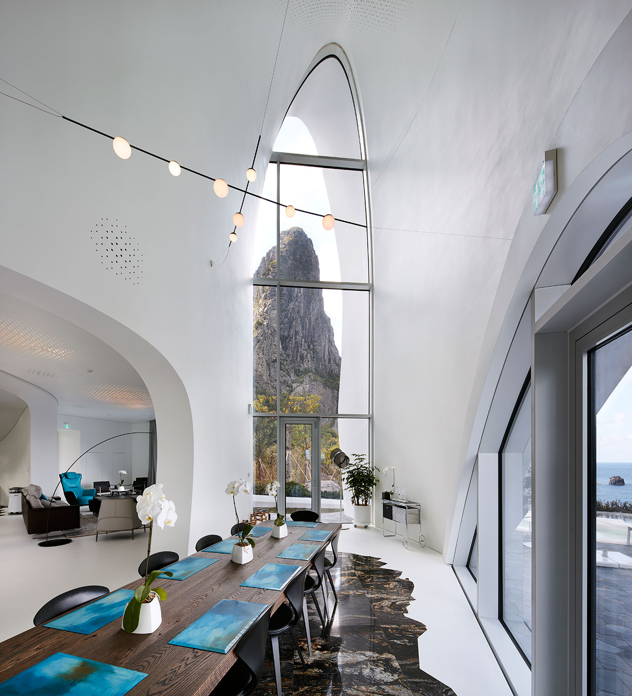 Avec sa forme tourbillonnante ressemblant à un coquillage de plis minces, Villa Kosmos est le plus spectaculaire des deux bâtiments du développement. Disponible pour louer seulement dans son ensemble, il contient quatre chambres à haut plafond et des espaces communs spacieux dont le design intérieur minimaliste a été inspiré par le concept taoïste des cinq éléments, ou Wu Xin – bois, terre, eau, feu et métal – qui représentent les cinq qualités dynamiques ou énergies qui peuvent être perçues dans tous les phénomènes naturels. Chaque espace est ainsi dominé par un élément et identifié par la planète correspondante: Jupiter, Saturne, Mercure, Mars et Vénus.