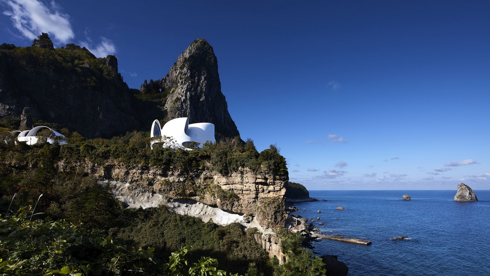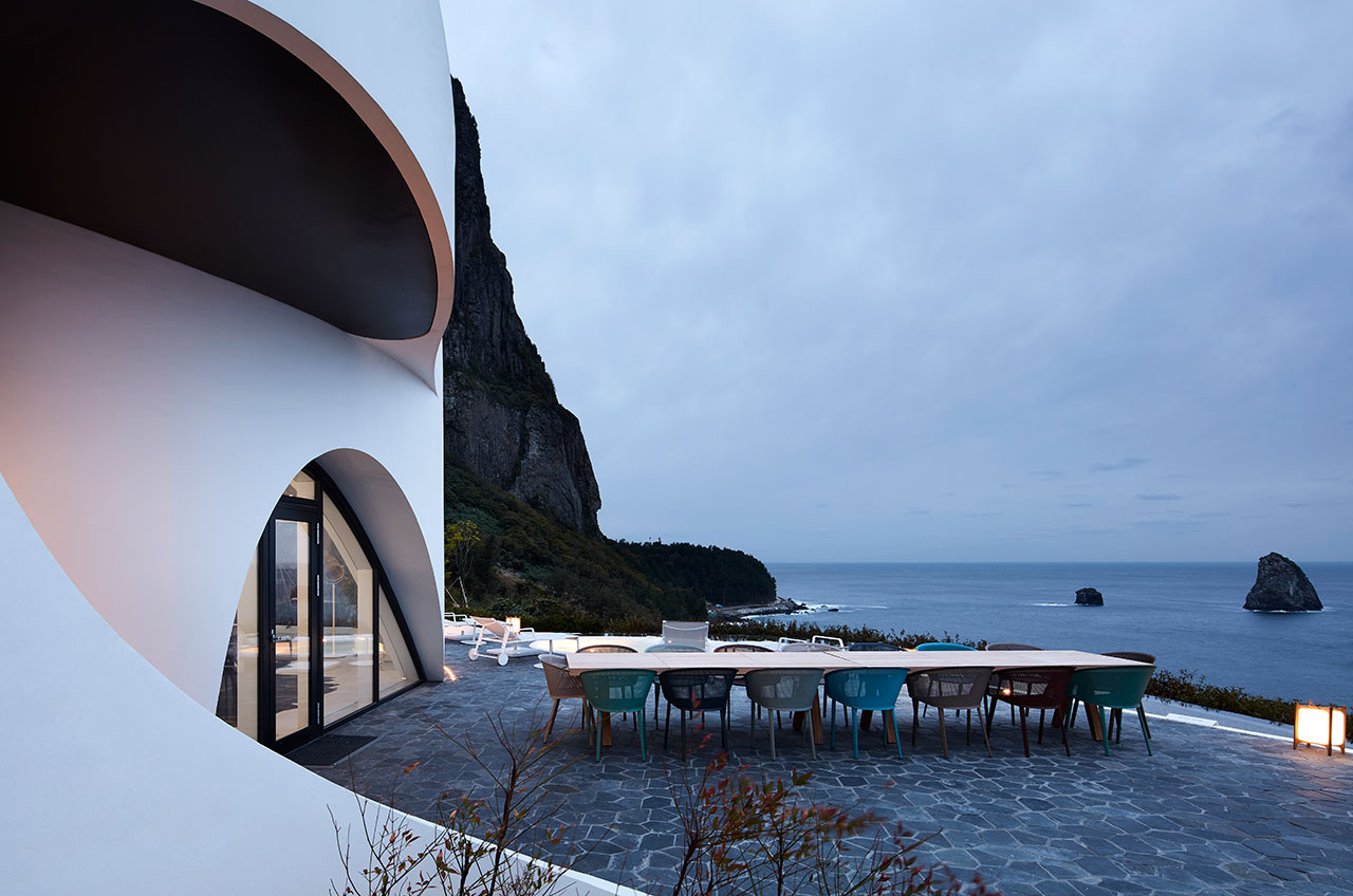 La villa KOSMOS est située sur une île volcanique à 120 kilomètres à l’est de la péninsule coréenne. Doté d’un paysage dense de sommets, de grottes et de cascades entourées de rivages rocheux – un cadre qui ressemble à l’île isolée de Jurassic Park – Assis au sommet d’un grand stratovolcan sous-marin dans la mer de l’Est, l’île sud-coréenne d’Ulleungdo bénéficie d’une topographie spectaculaire et d’une écologie locale unique qui offre un cadre pittoresque pour des promenades, des randonnées et des promenades en bateau. observez les phénomènes célestes. Mais plus que cela, Ulleungdo est également connu pour les champs d’énergie « chi » puissants dont le pouvoir de rajeunissement circulerait à travers l’île. À cet égard, la villa KOSMOS ne pourrait pas être idéalement situé du côté de Songgot-bong, ou «Ice Pick Peak», une formation rocheuse qui semble aussi impressionnante que cela puisse paraître. Et si cela ne suffisait pas, la station est construite sur le bord d’une falaise qui plonge radicalement à trente mètres de la mer, avec de superbes vues sur Elephant Rock, une formation rocheuse au milieu de la mer en forme d’éléphant avec son tronc trempé dans l’eau.