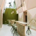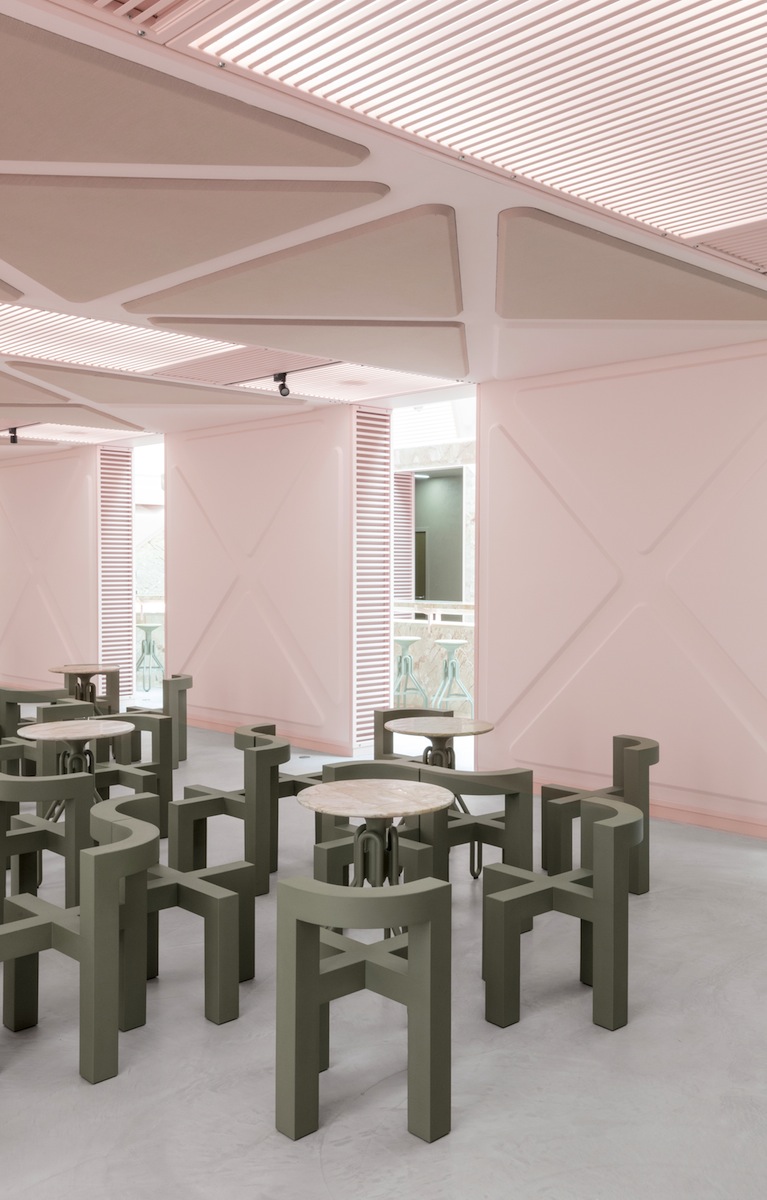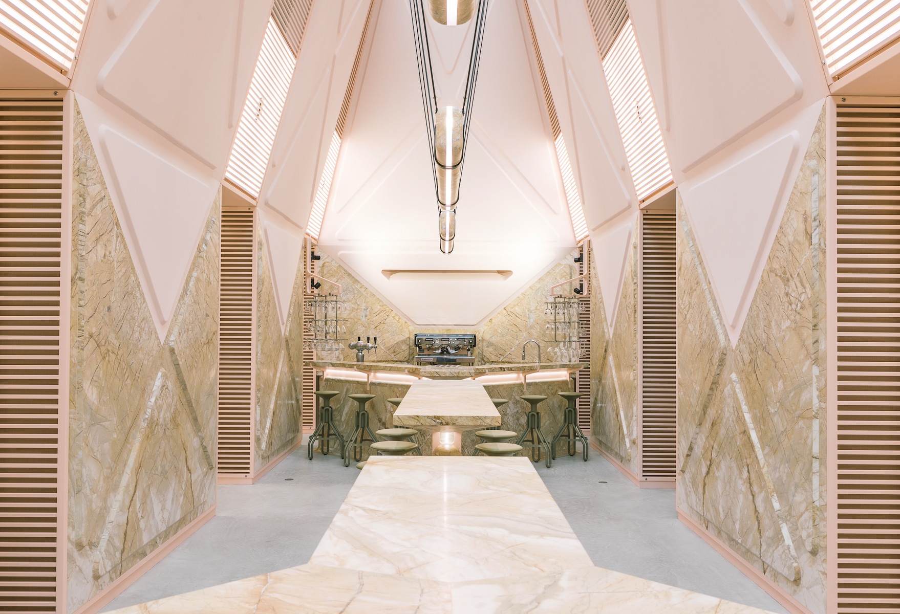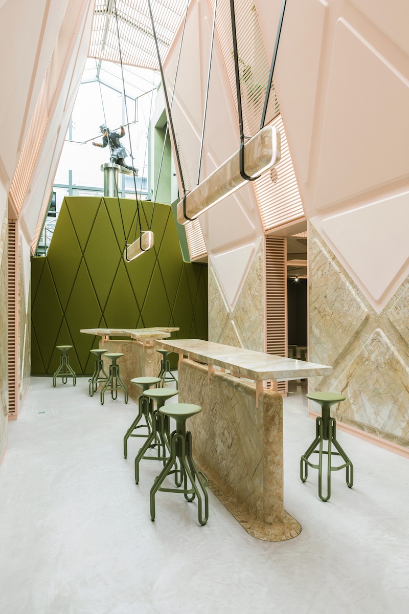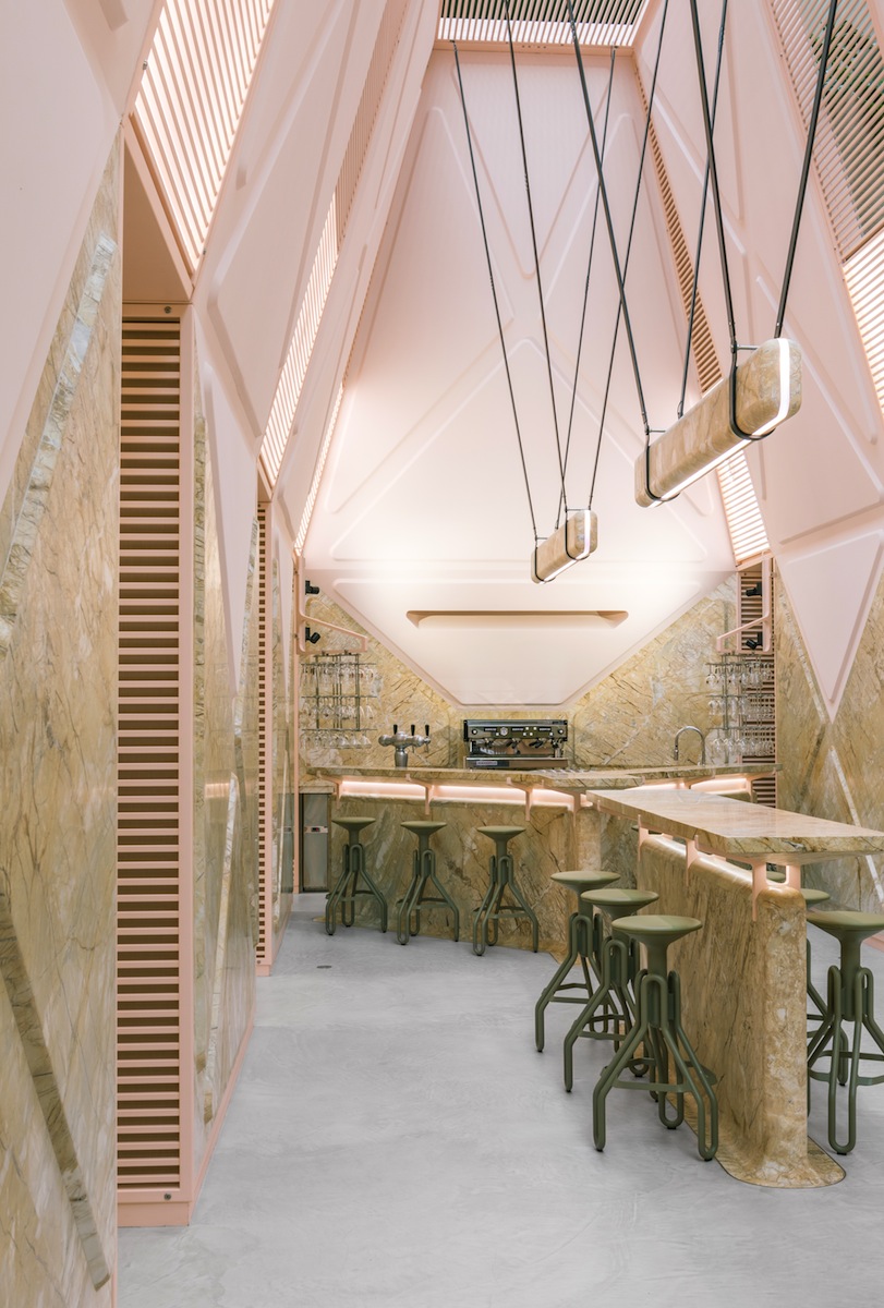 Le mobilier est constitué d’éléments fixes réalisés en marbre (comptoir, îlots et suspensions lumineuses), de tables et tabourets hauts et d’une série de sièges rotomoulés en polypropylène.
