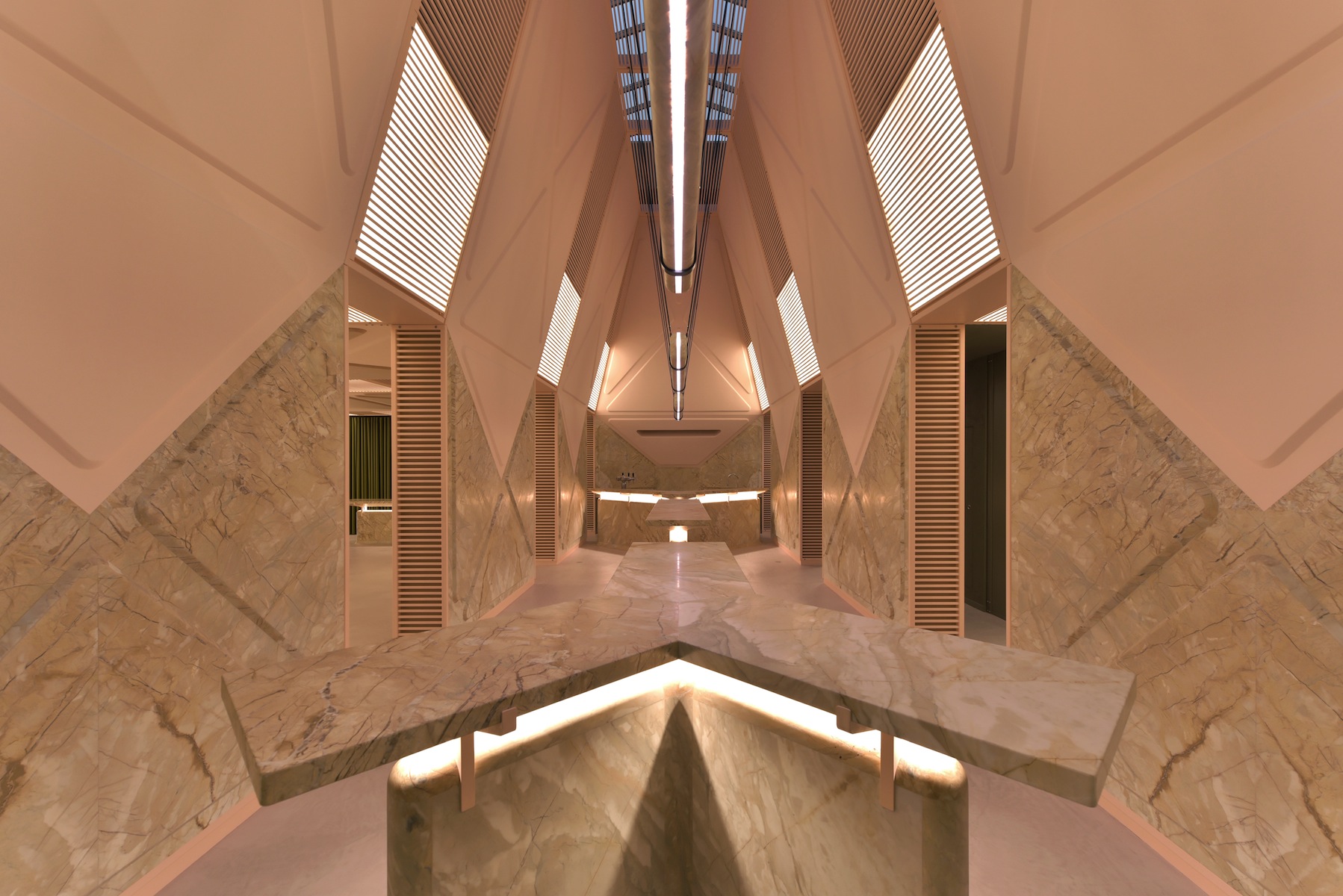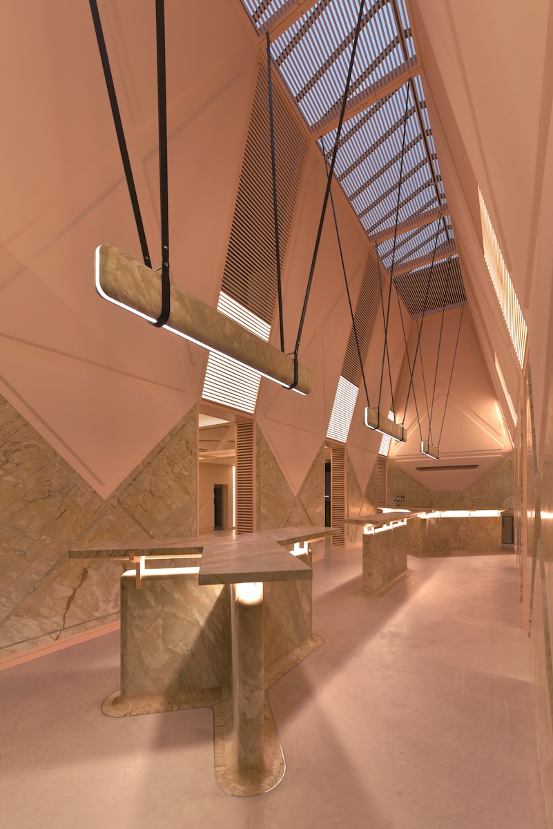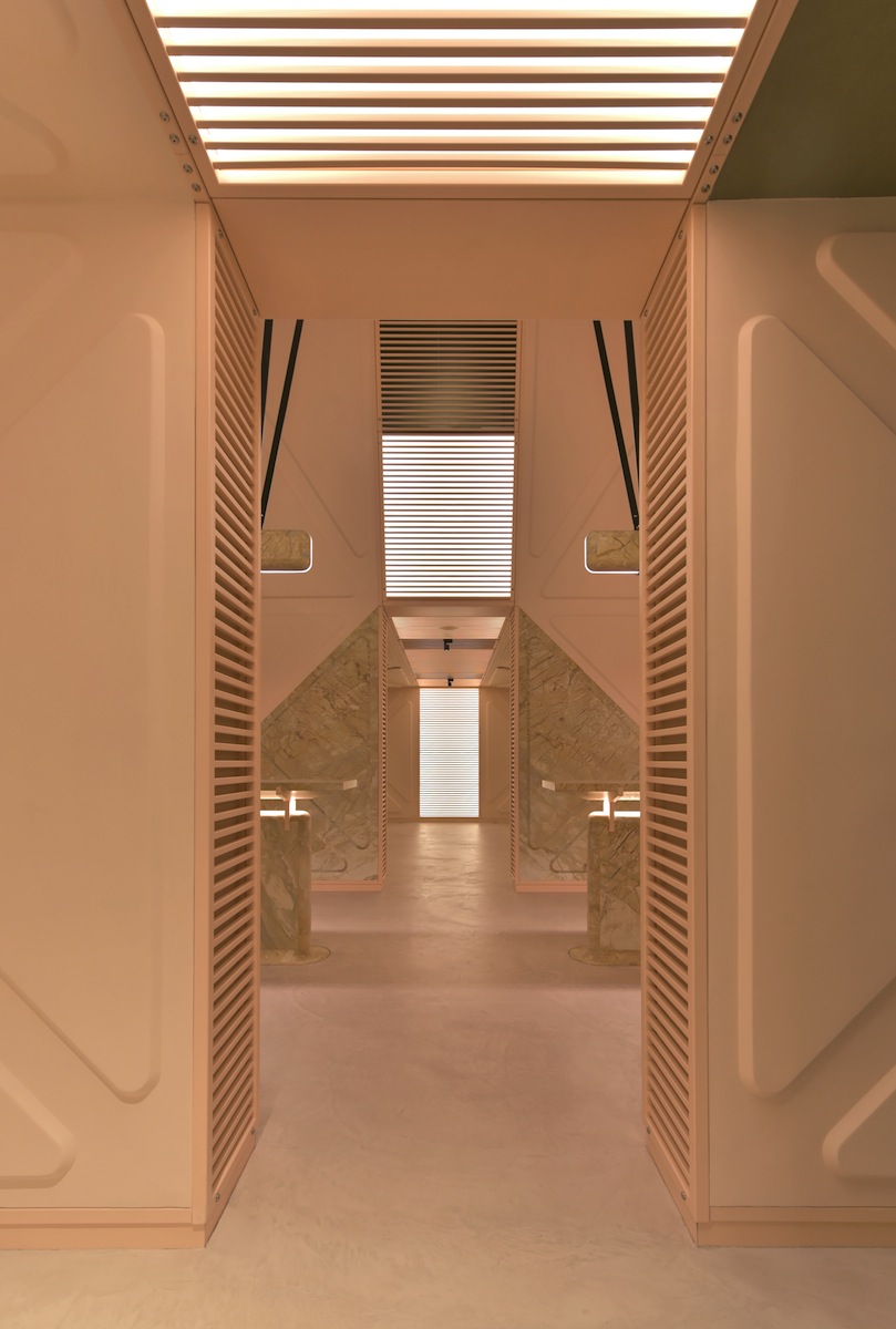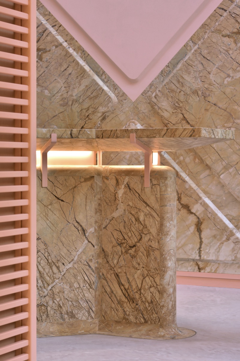 Le mobilier est constitué d’éléments fixes réalisés en marbre (comptoir, îlots et suspensions lumineuses), de tables et tabourets hauts et d’une série de sièges rotomoulés en polypropylène.